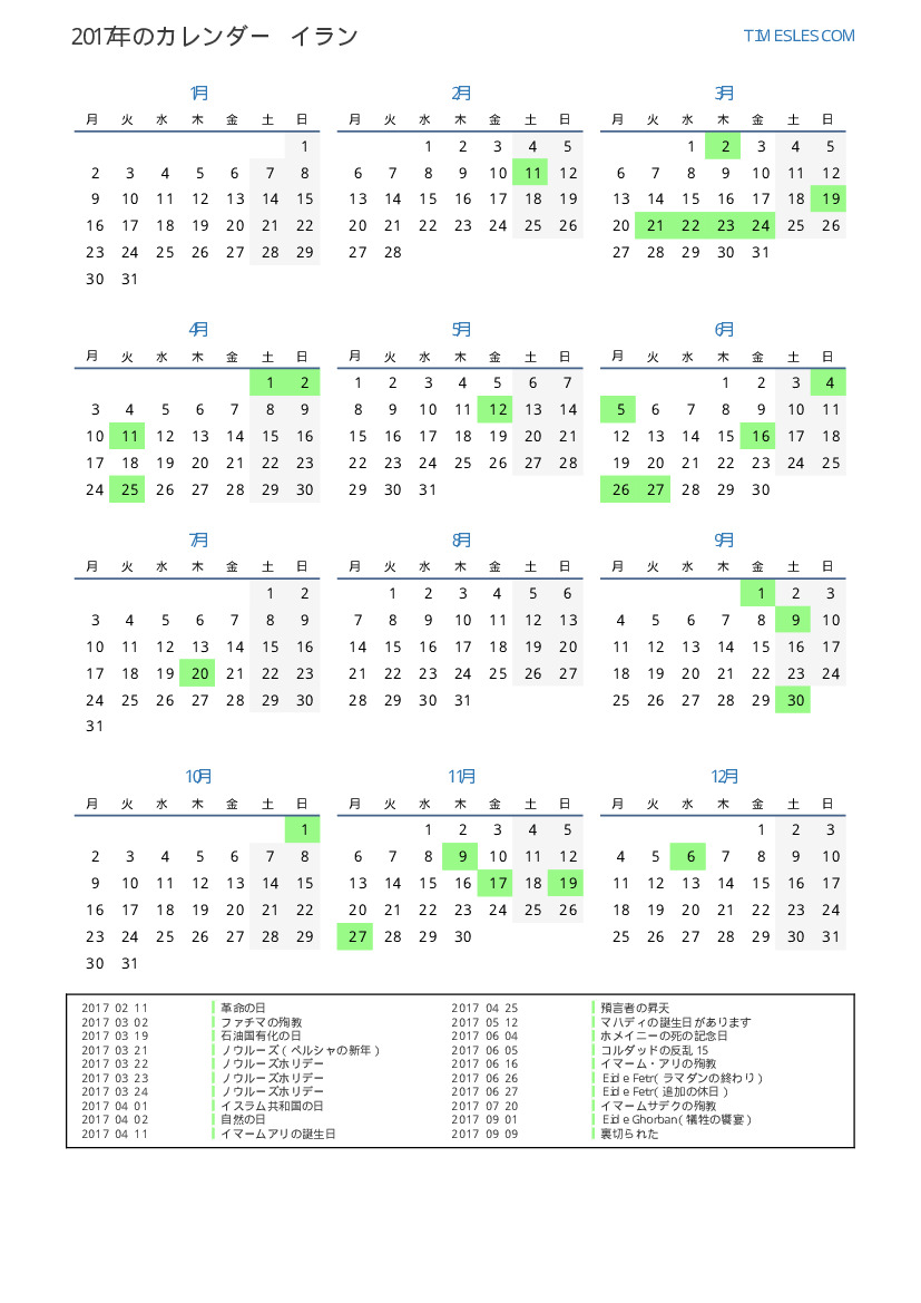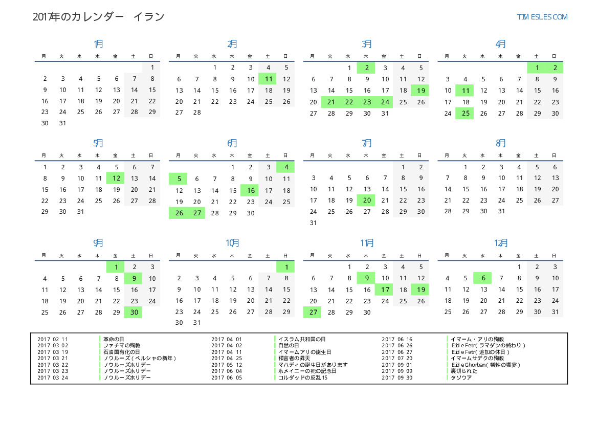 イランのために2017年の休日と週末を含むPDFカレンダーをダウンロードして印刷します