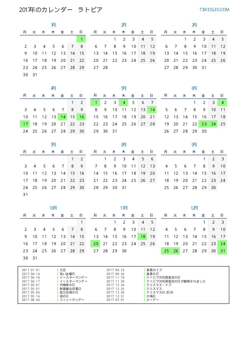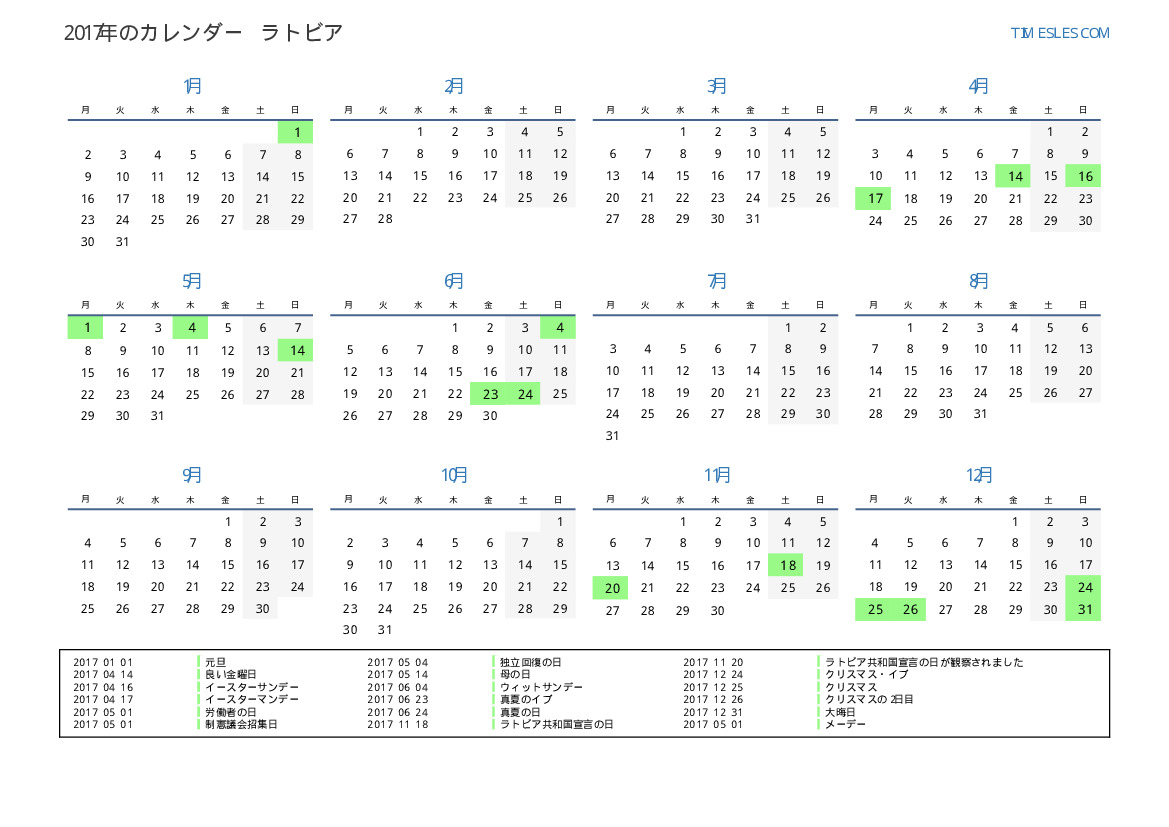 ラトビア向け2017年の休日と週末を含むPDFカレンダーをダウンロードして印刷します