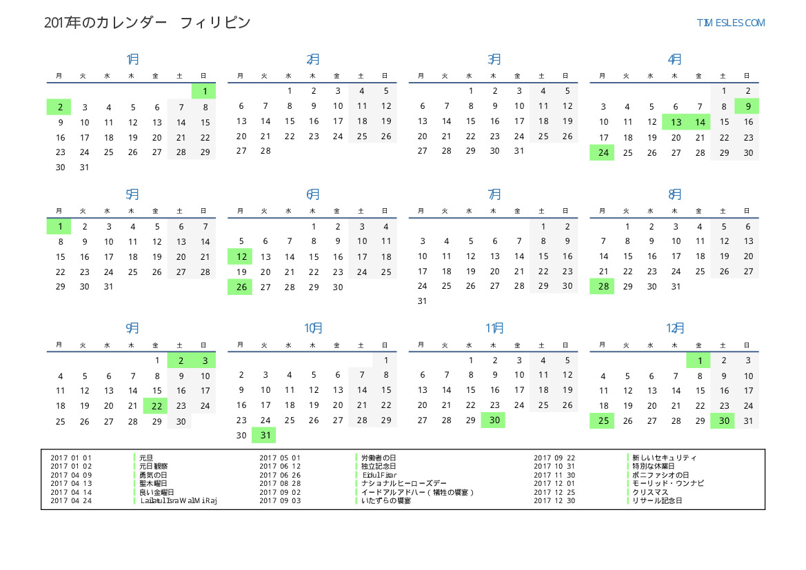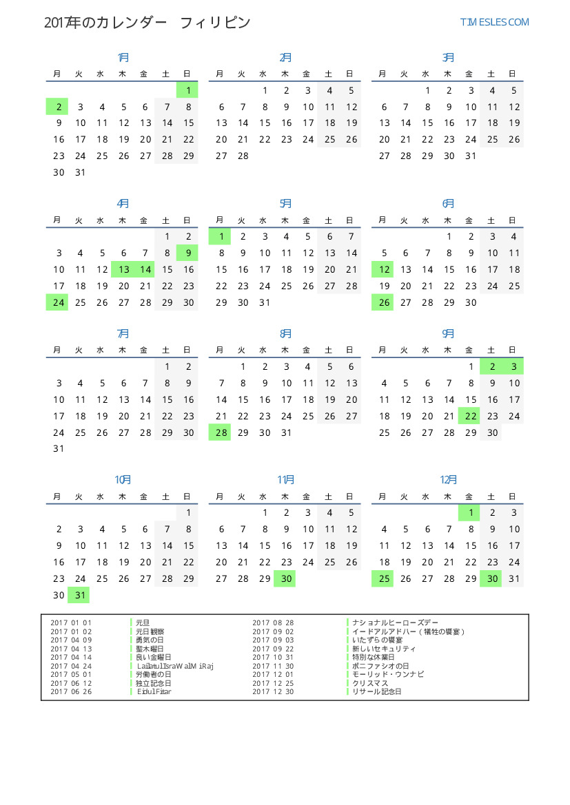 フィリピン向け2017年の休日と週末を含むPDFカレンダーをダウンロードして印刷します