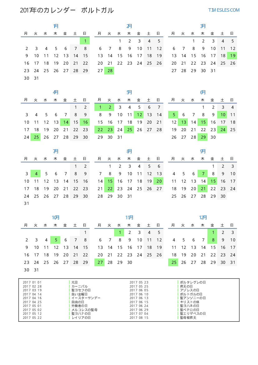 ポルトガル向けの2017年の休日と週末のカレンダー
