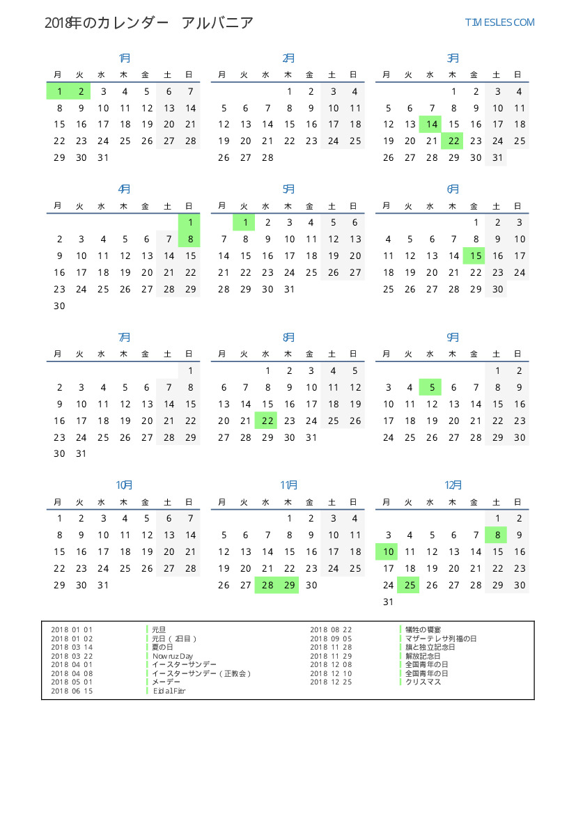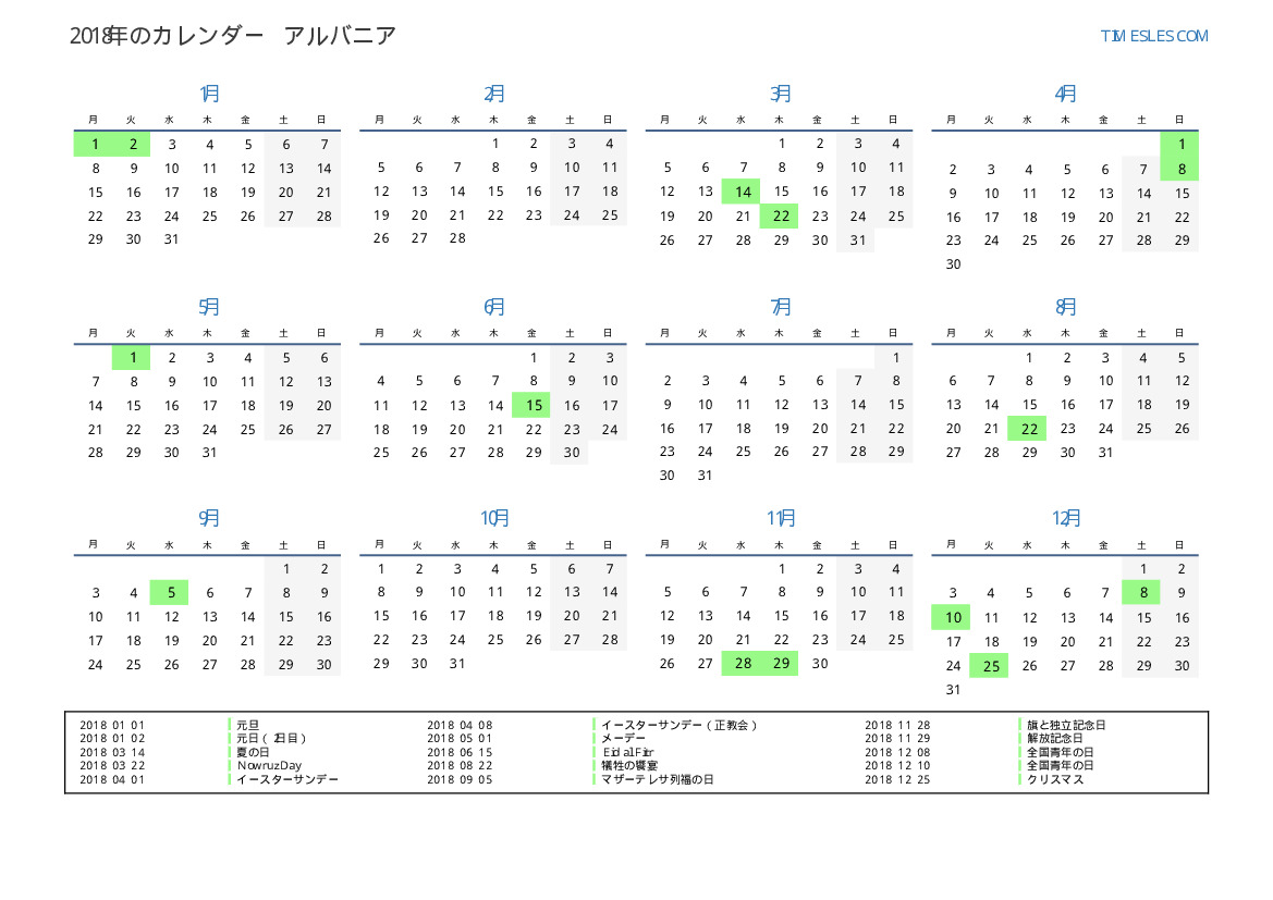 アルバニアの場合2018年カレンダー