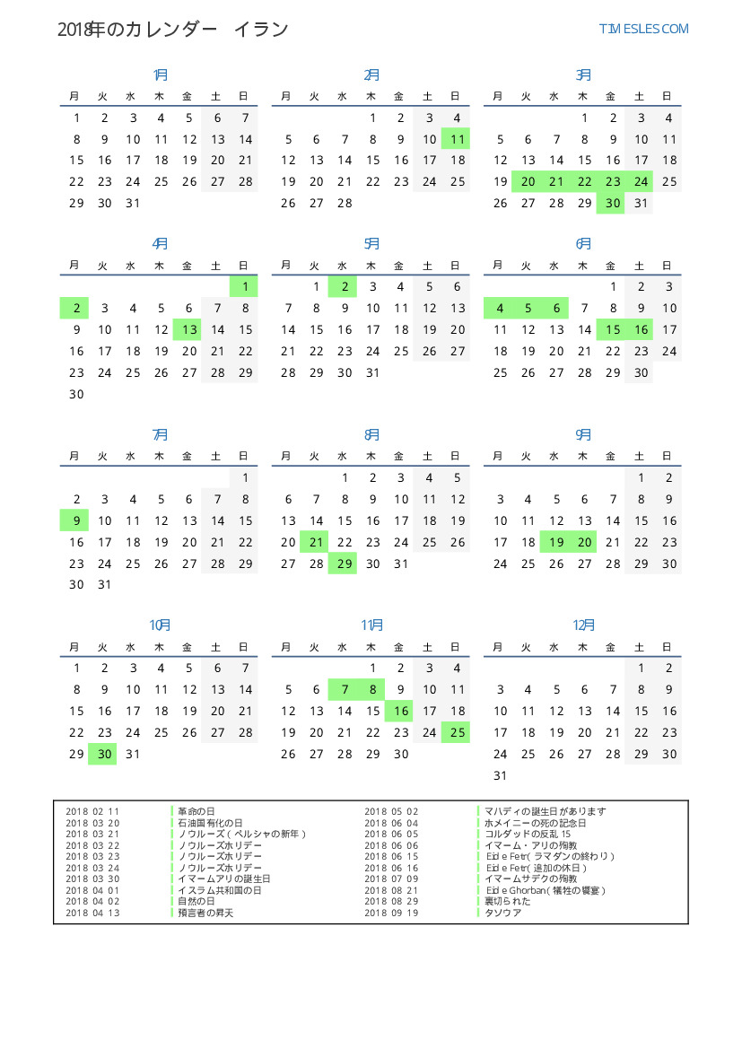 イランのためにの2018年の休日と週末のカレンダー