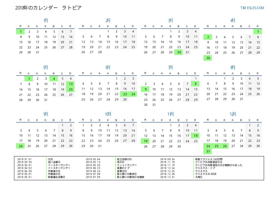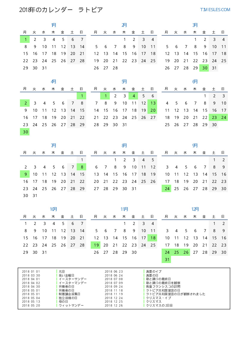 ラトビア向け2018年の休日と週末を含むPDFカレンダーをダウンロードして印刷します