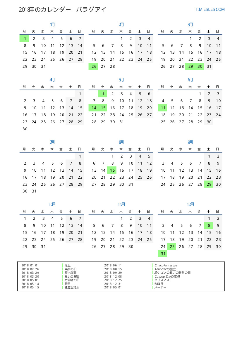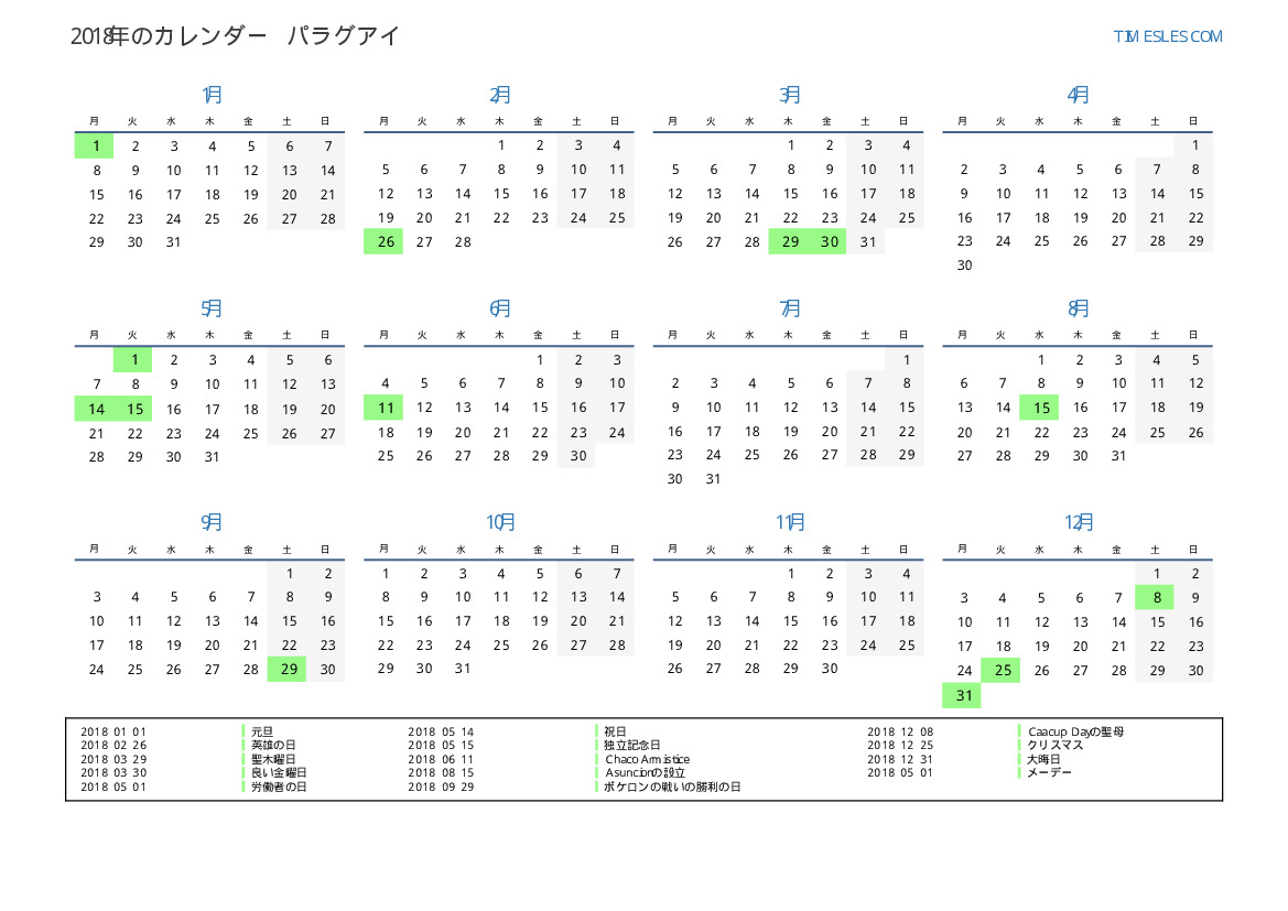 パラグアイ向けの2018年の休日と週末のカレンダー