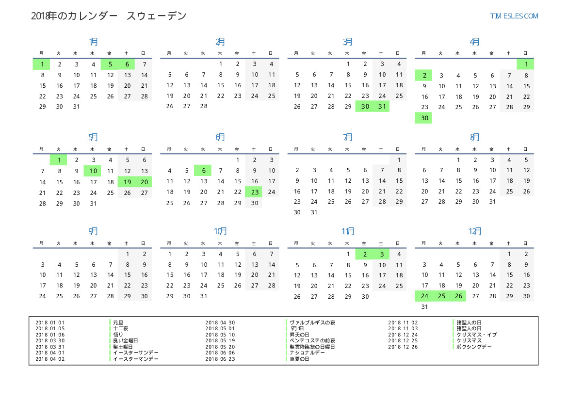 スウェーデン向けの2018年の休日と週末のカレンダー