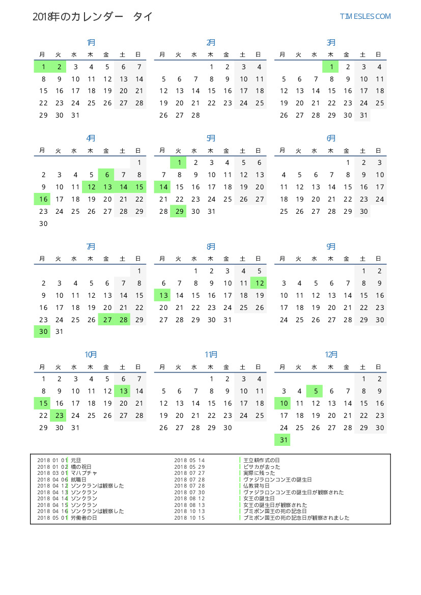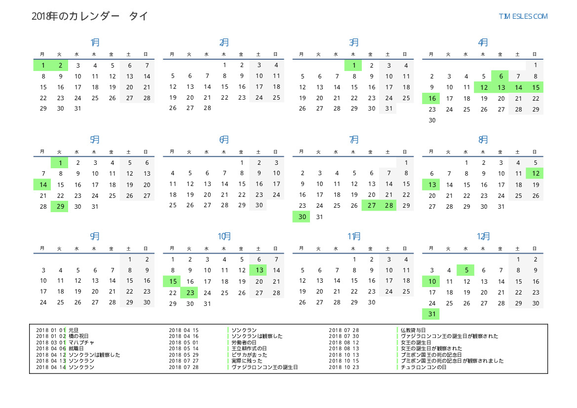 タイ向けの2018年の休日と週末のカレンダー