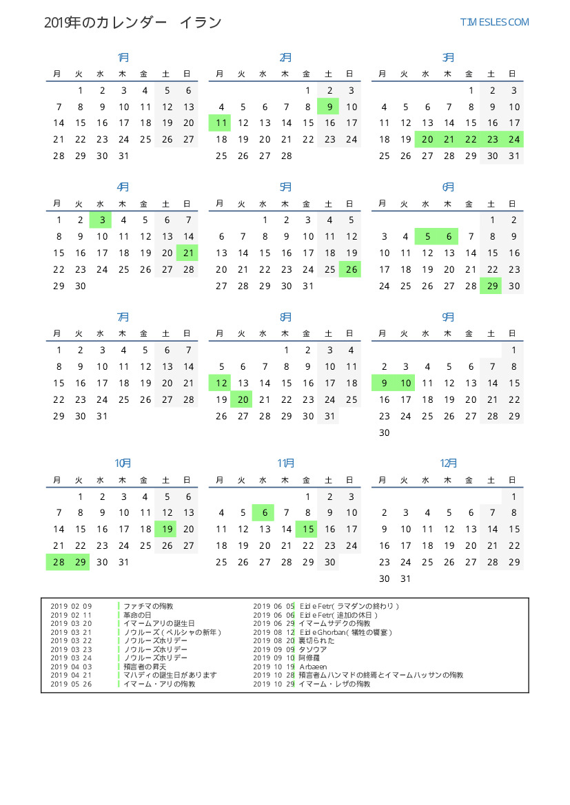 イランのために2019年の休日と週末を含むPDFカレンダーをダウンロードして印刷します