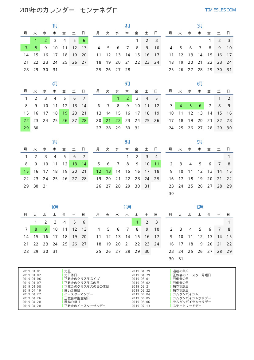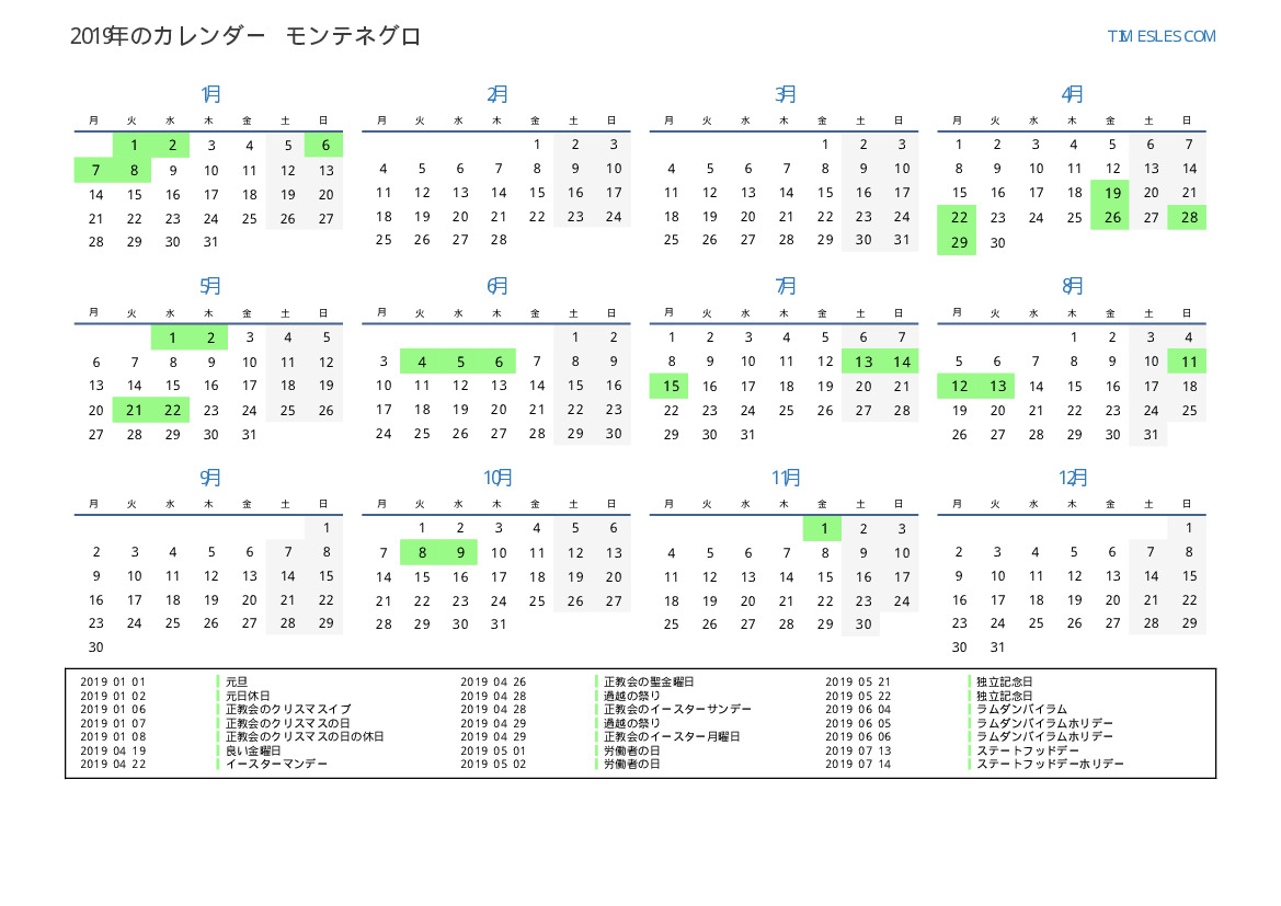 モンテネグロ向けの2019年の休日と週末のカレンダー