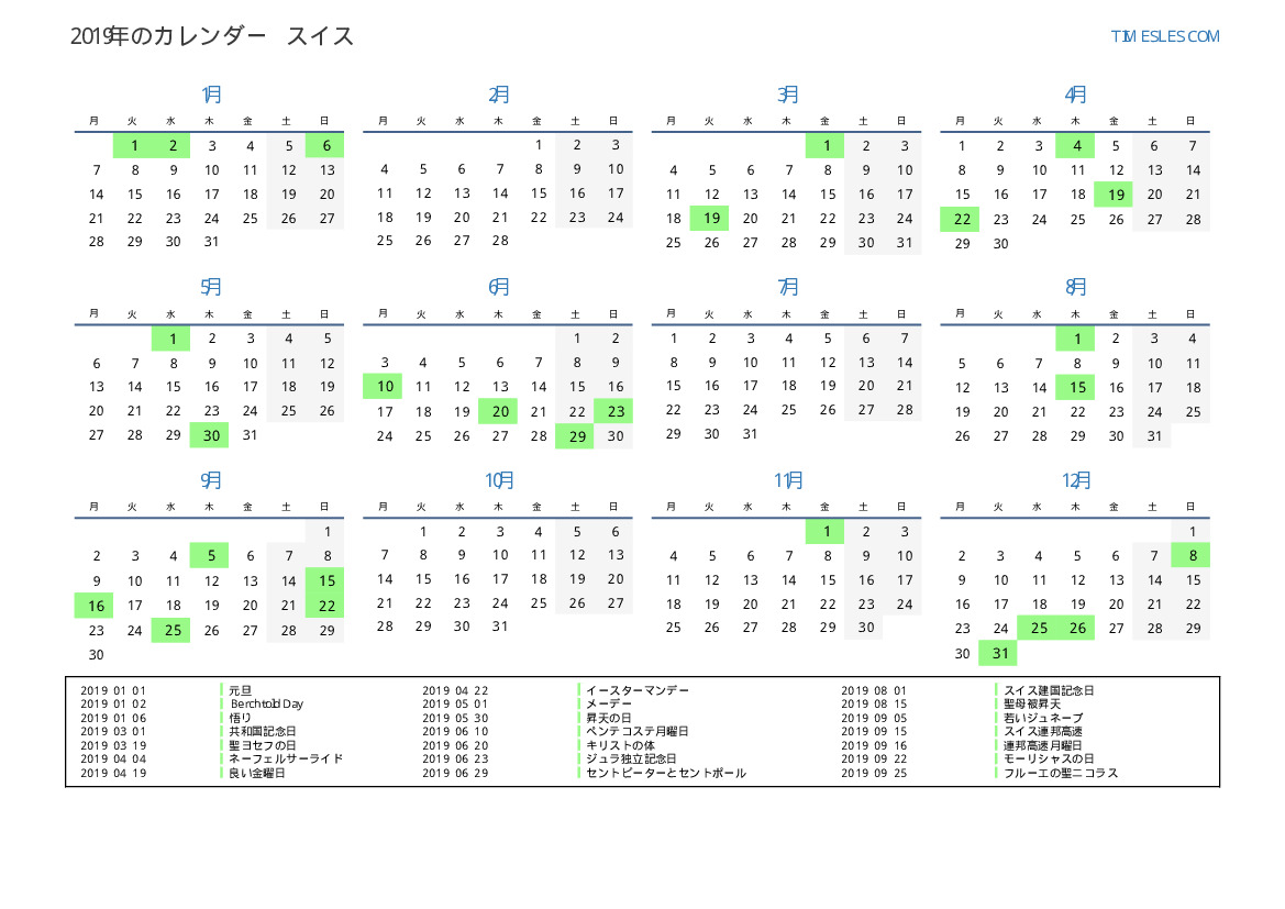 スイス向けの2019年の休日と週末のカレンダー