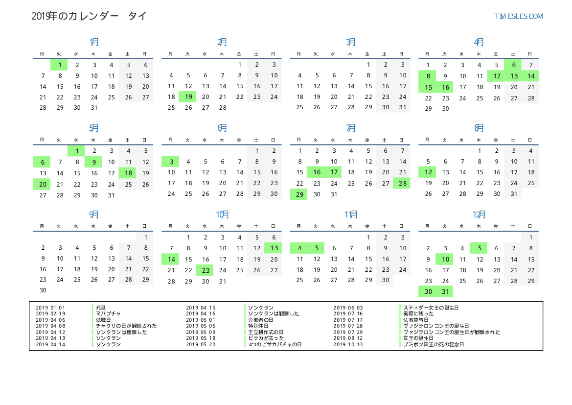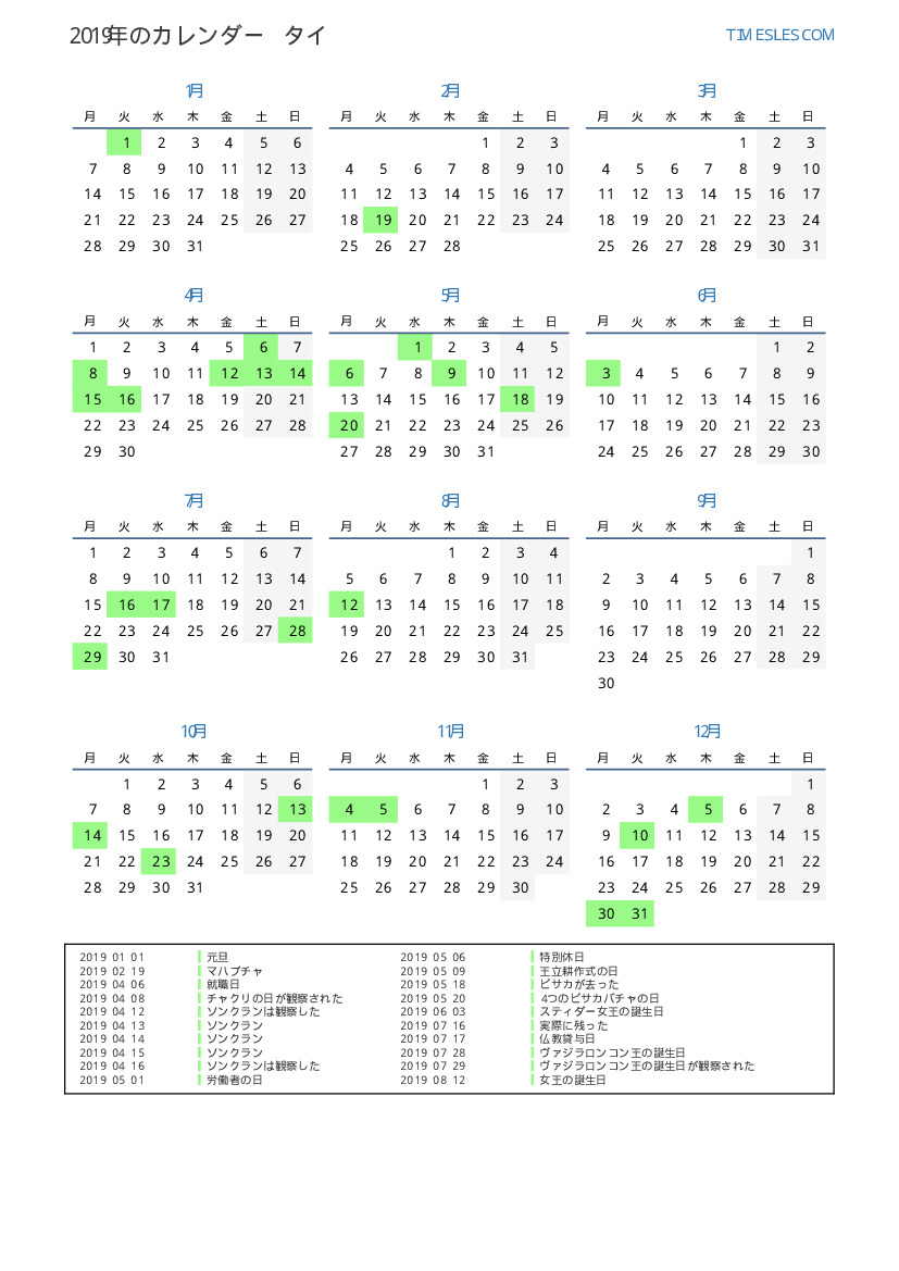 タイ向け2019年の休日と週末を含むPDFカレンダーをダウンロードして印刷します