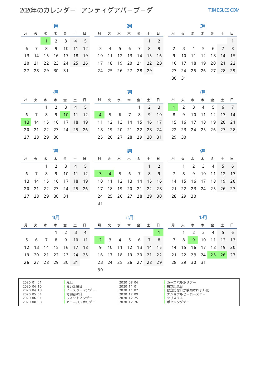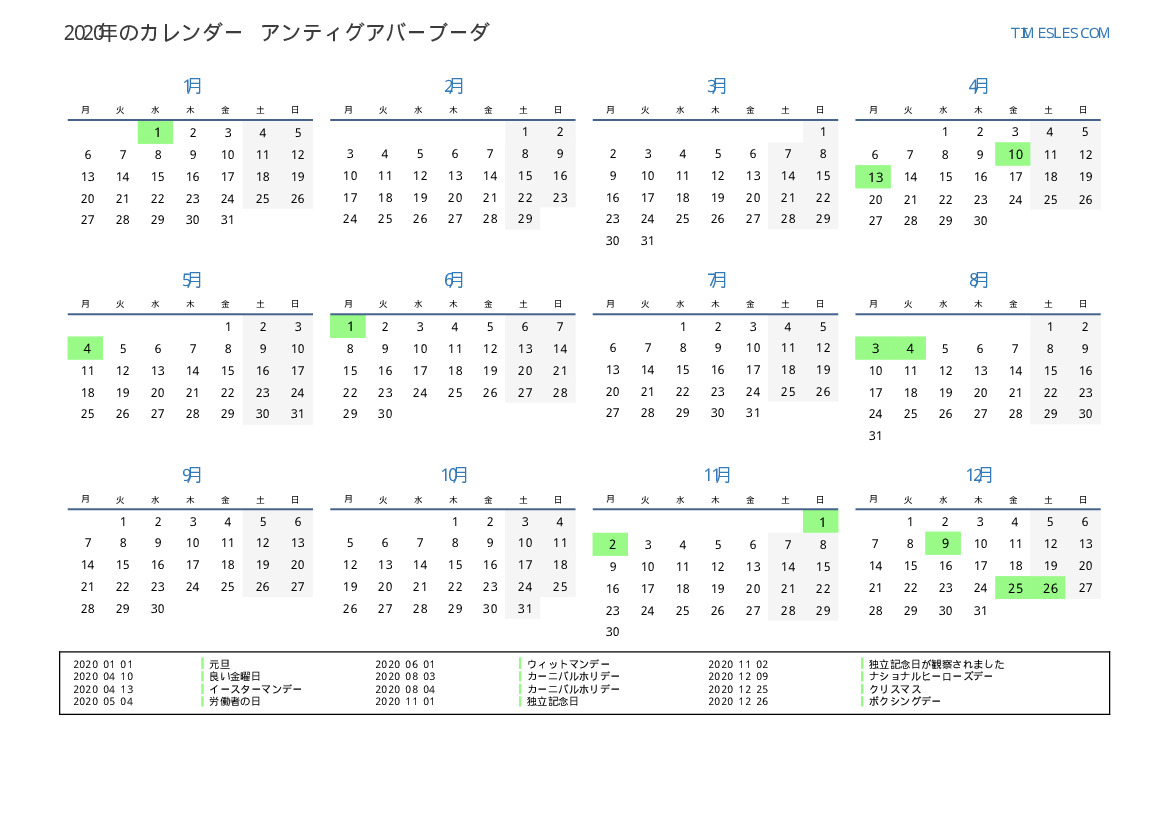 アンティグアバーブーダの2020年の休日と週末のカレンダー