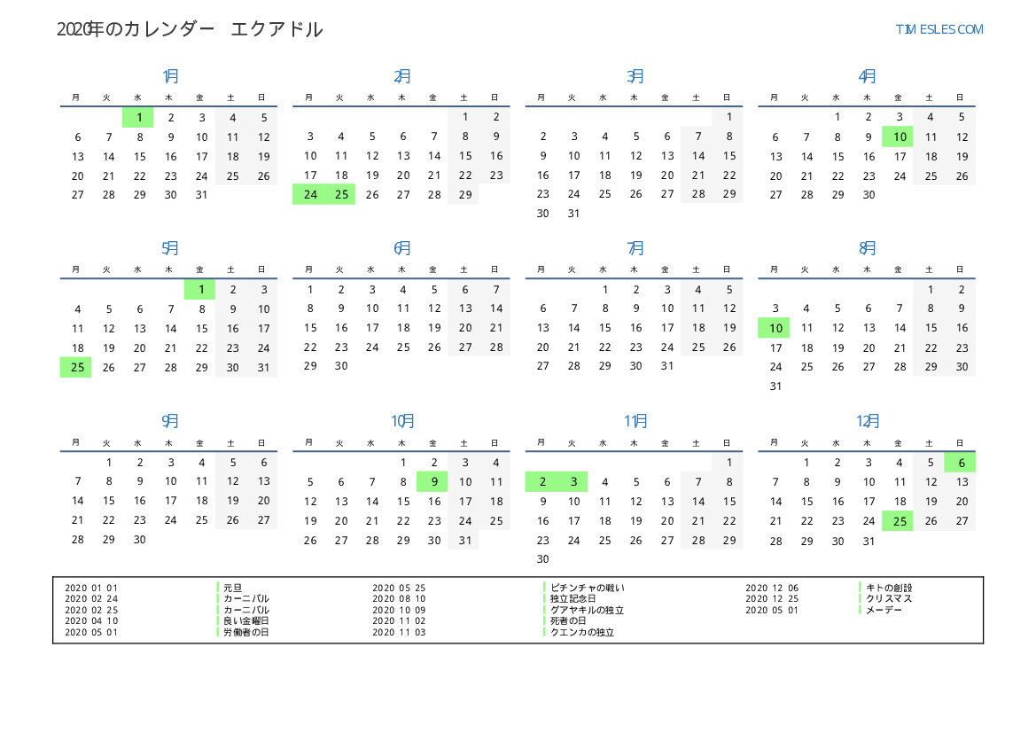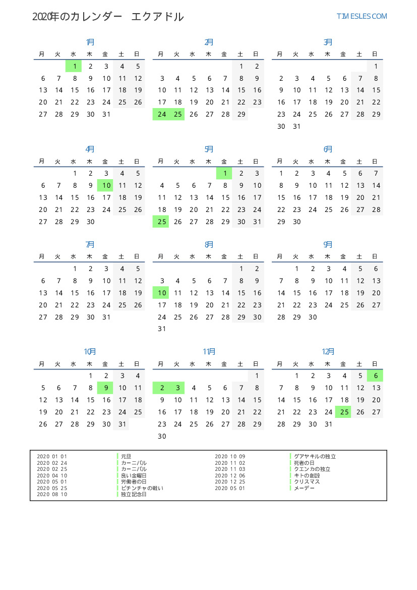 エクアドル向け2020年の休日と週末を含むPDFカレンダーをダウンロードして印刷します