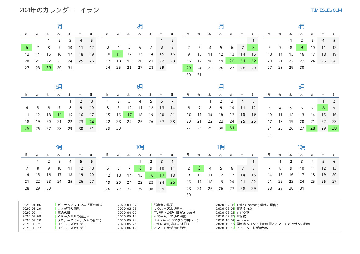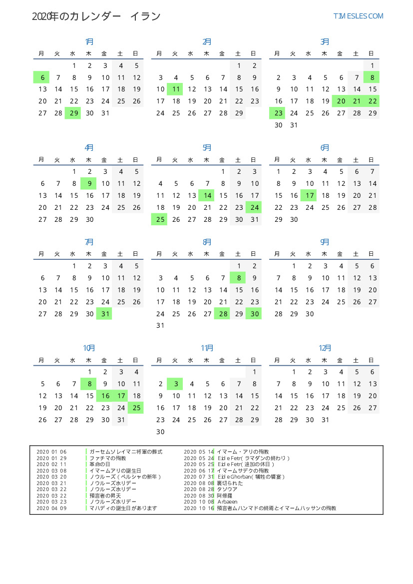 イランのために2020年の休日と週末を含むPDFカレンダーをダウンロードして印刷します
