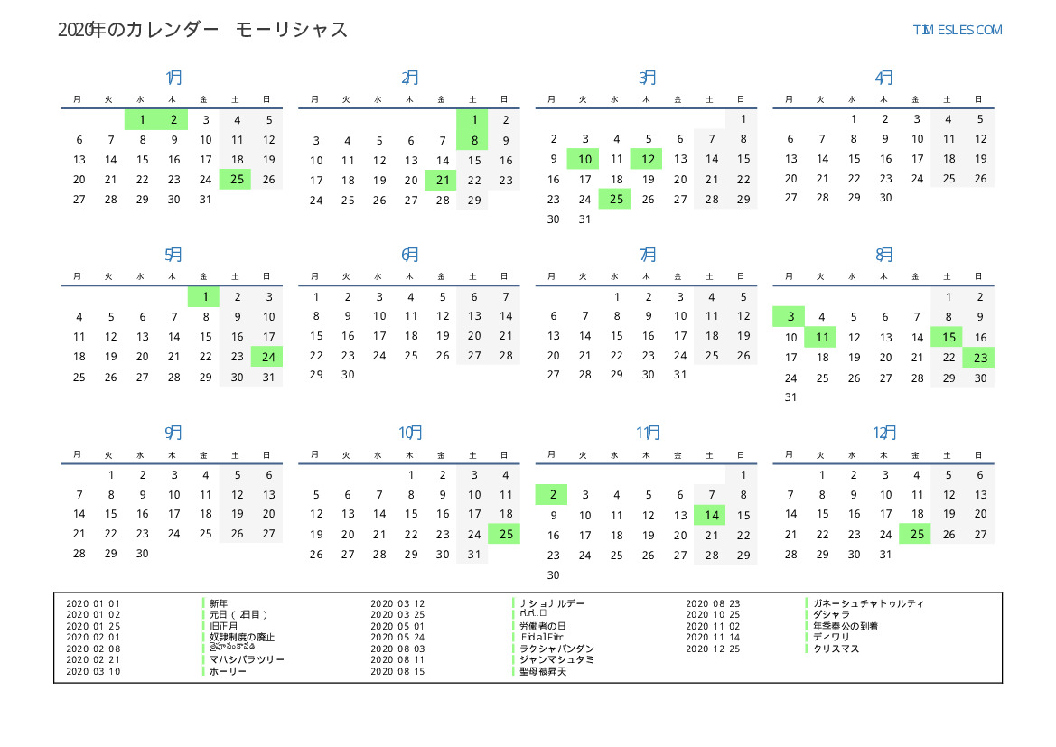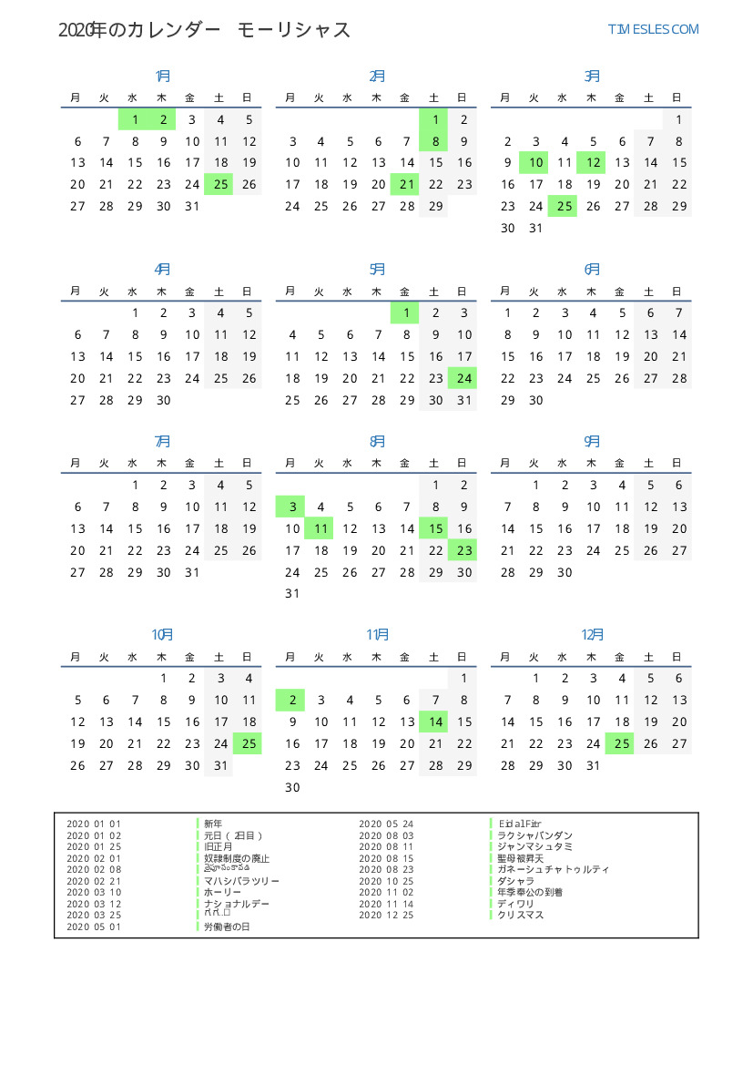 モーリシャスのためにの2020年の休日と週末のカレンダー