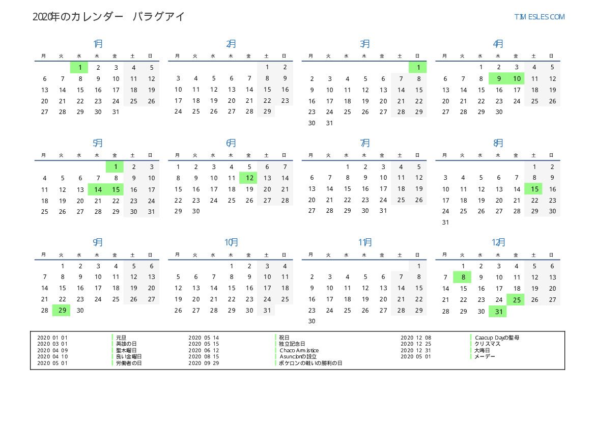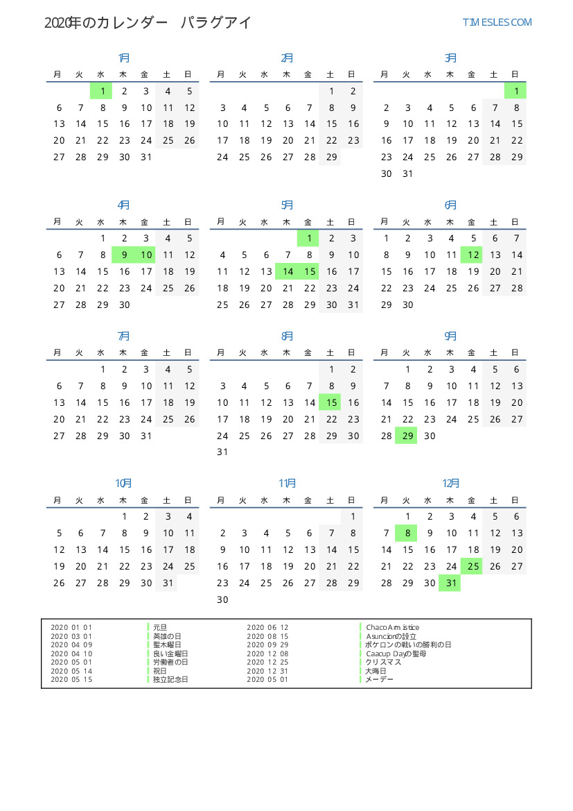 パラグアイ向けの2020年の休日と週末のカレンダー