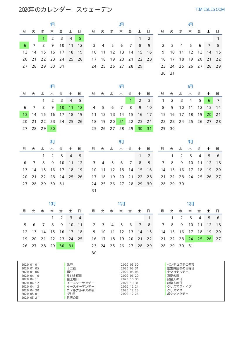 スウェーデン向け2020年カレンダー