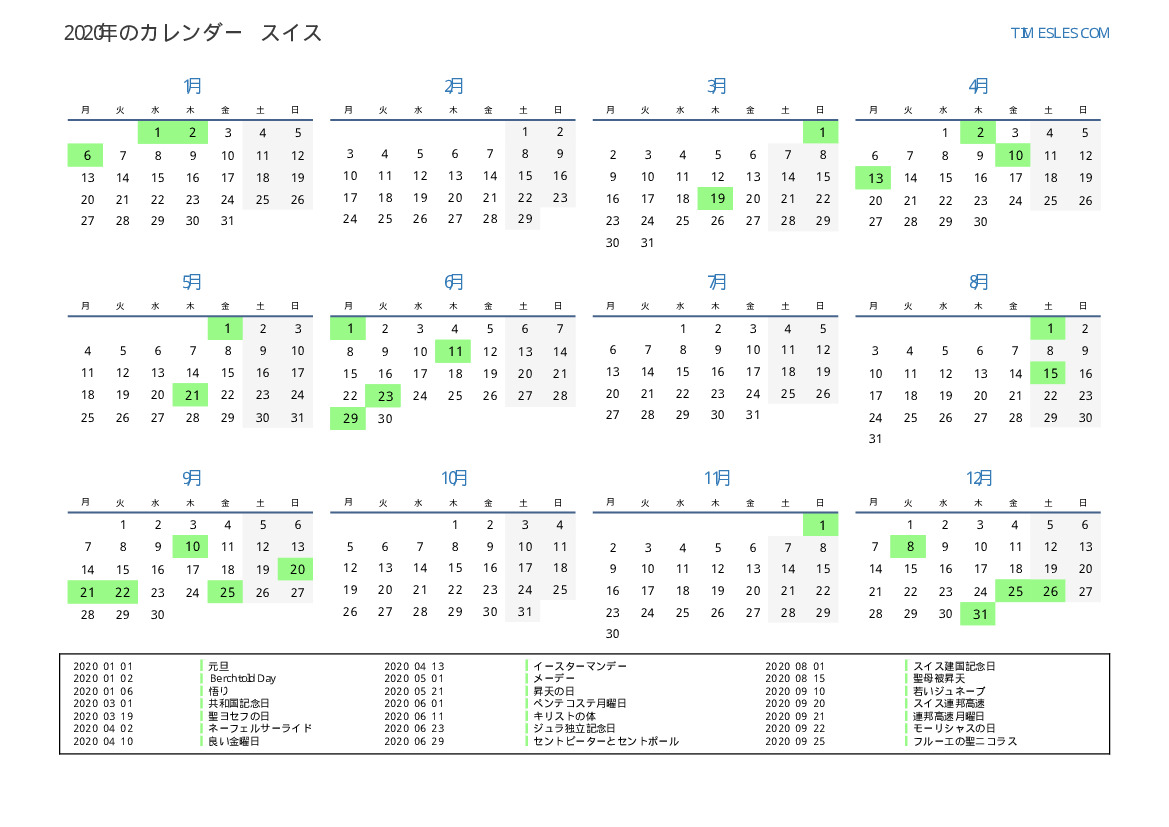 スイス向けの2020年の休日と週末のカレンダー