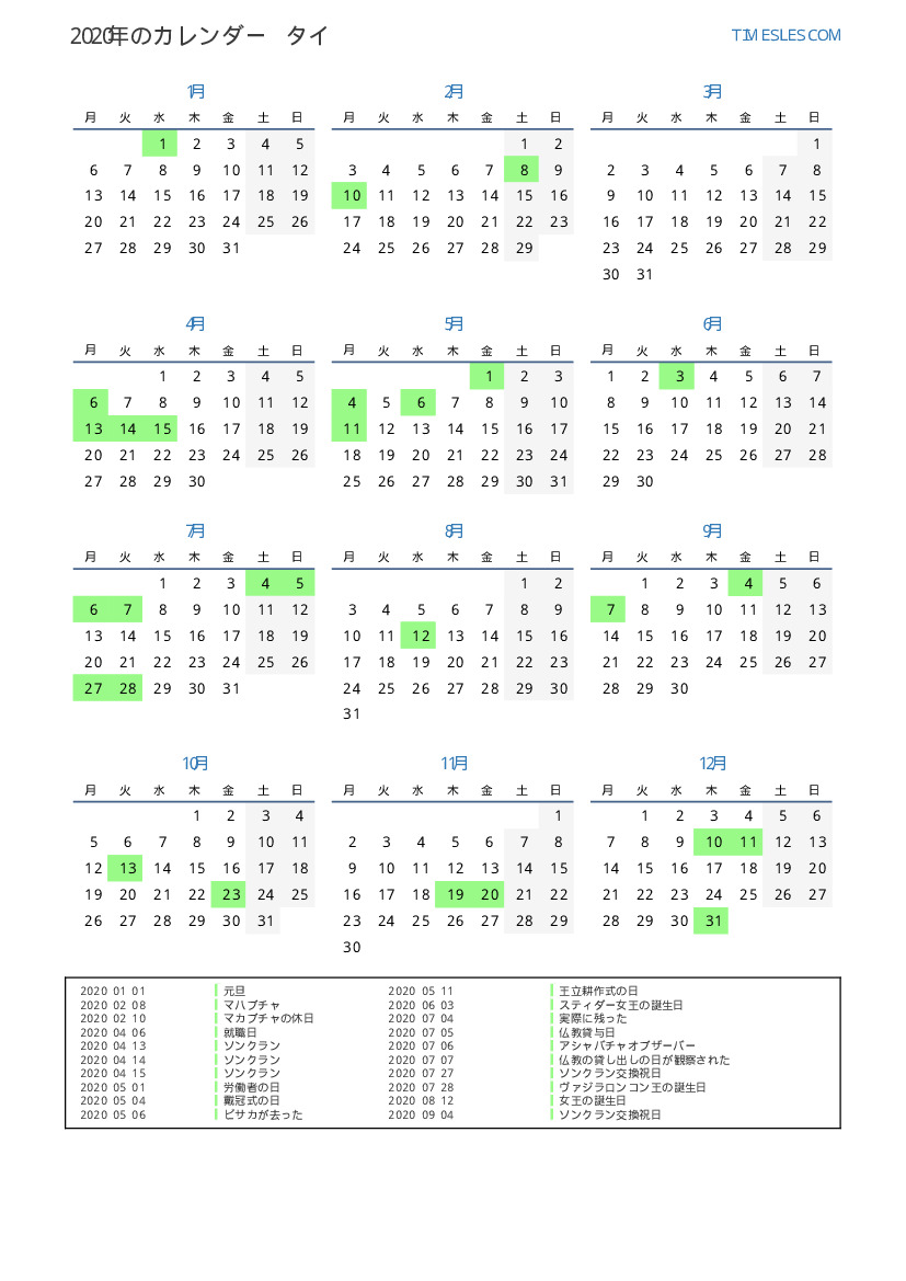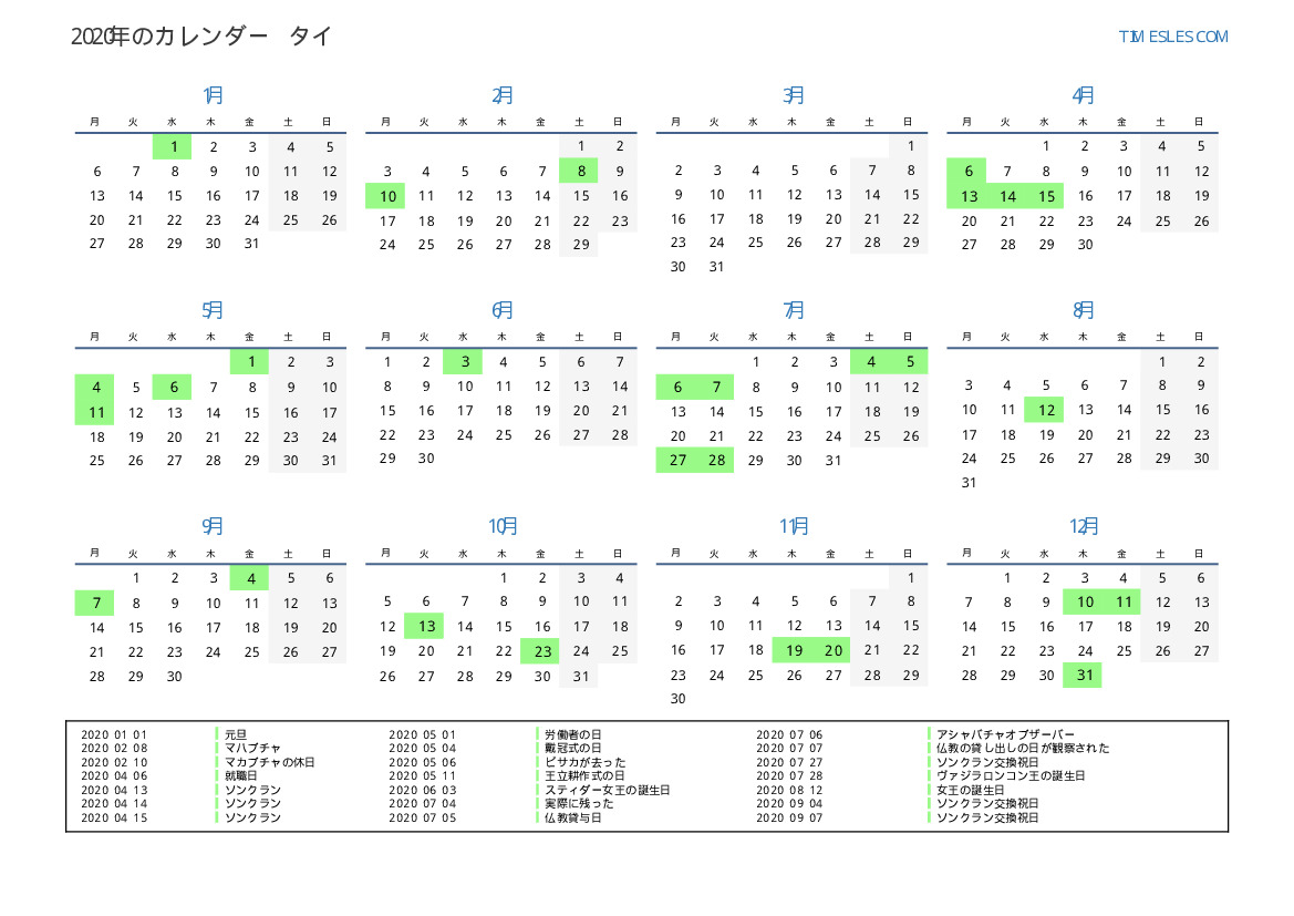 タイ向け2020年の休日と週末を含むPDFカレンダーをダウンロードして印刷します