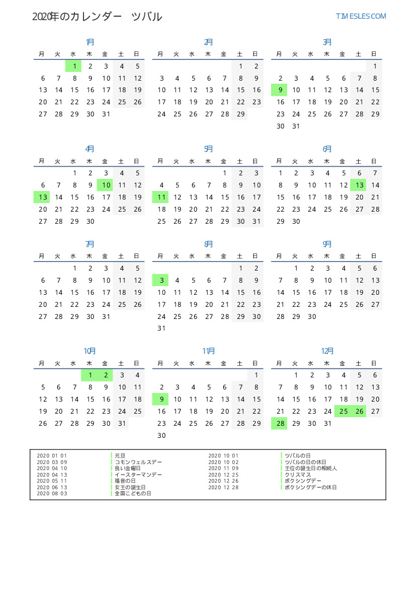 ツバル向けの2020年の休日と週末のカレンダー