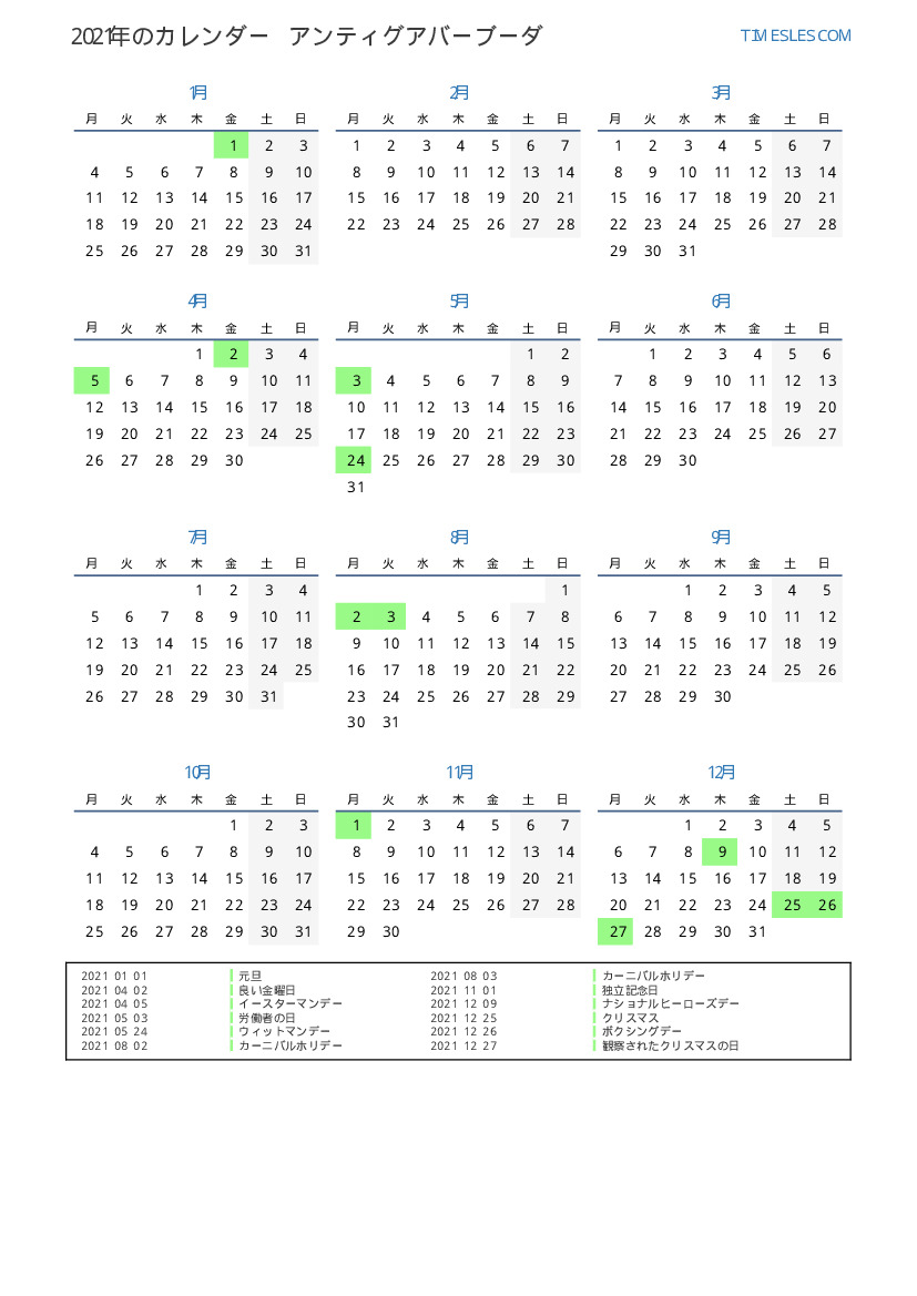 アンティグアバーブーダ2021年の休日と週末を含むPDFカレンダーをダウンロードして印刷します
