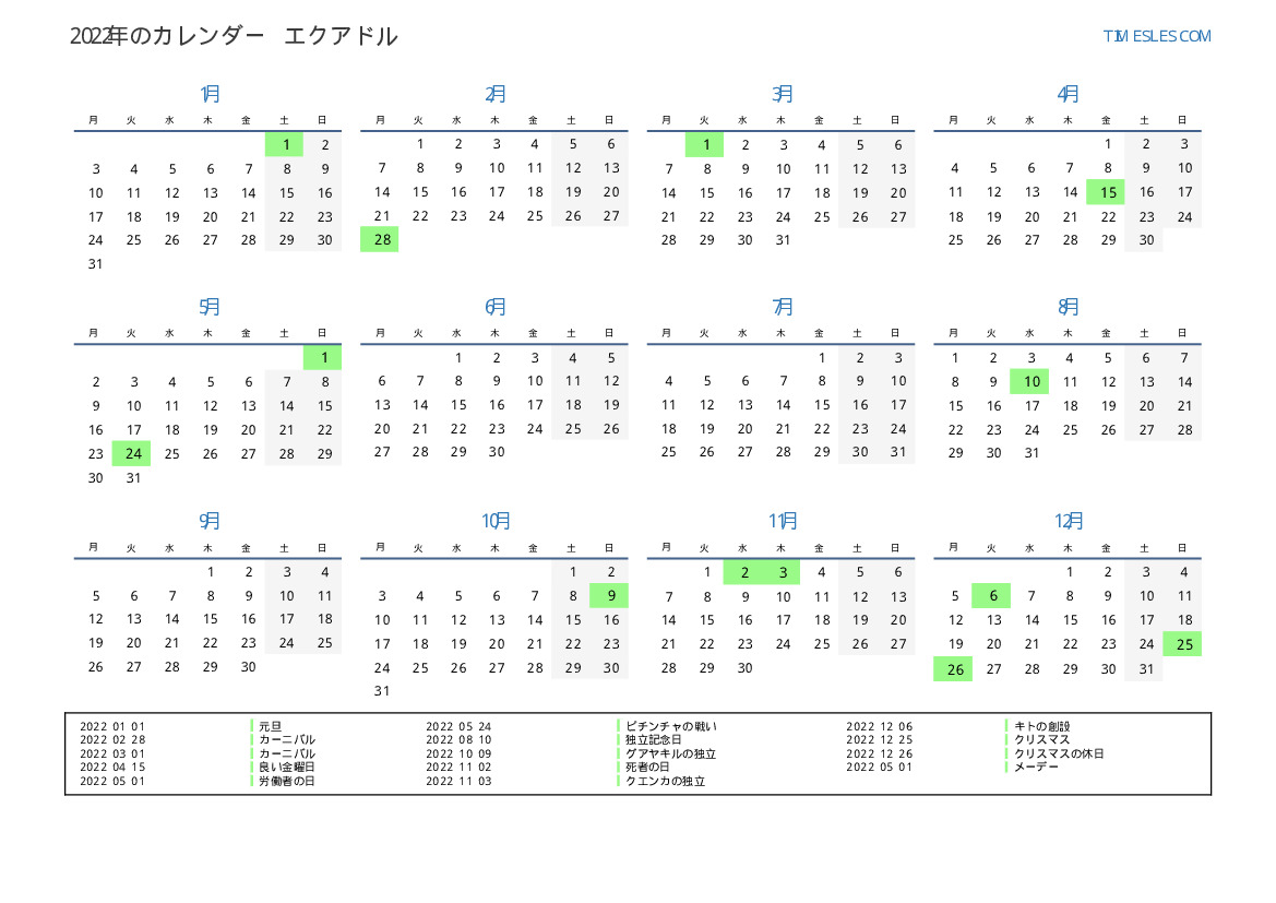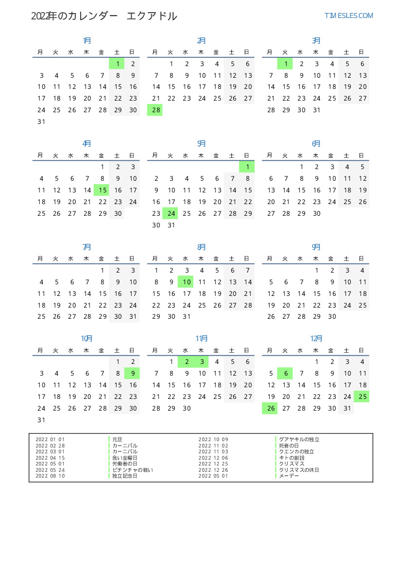 エクアドル向けの2022年の休日と週末のカレンダー