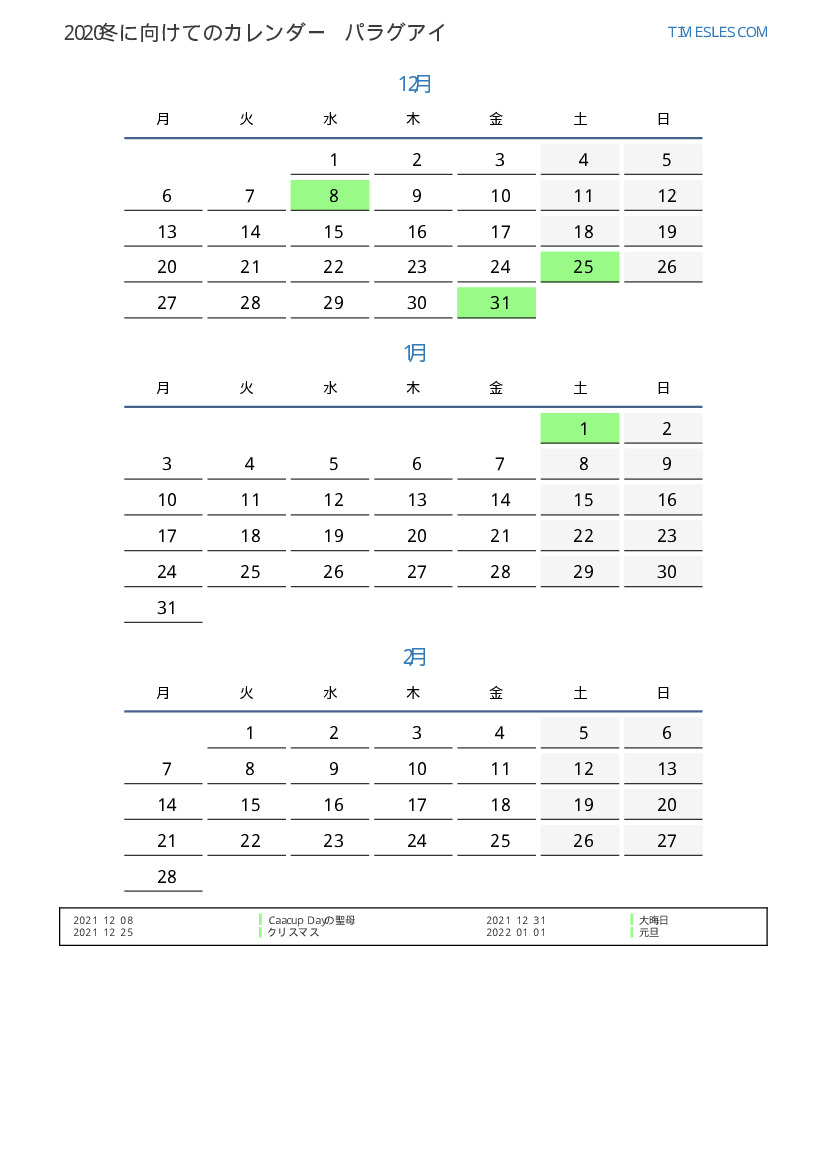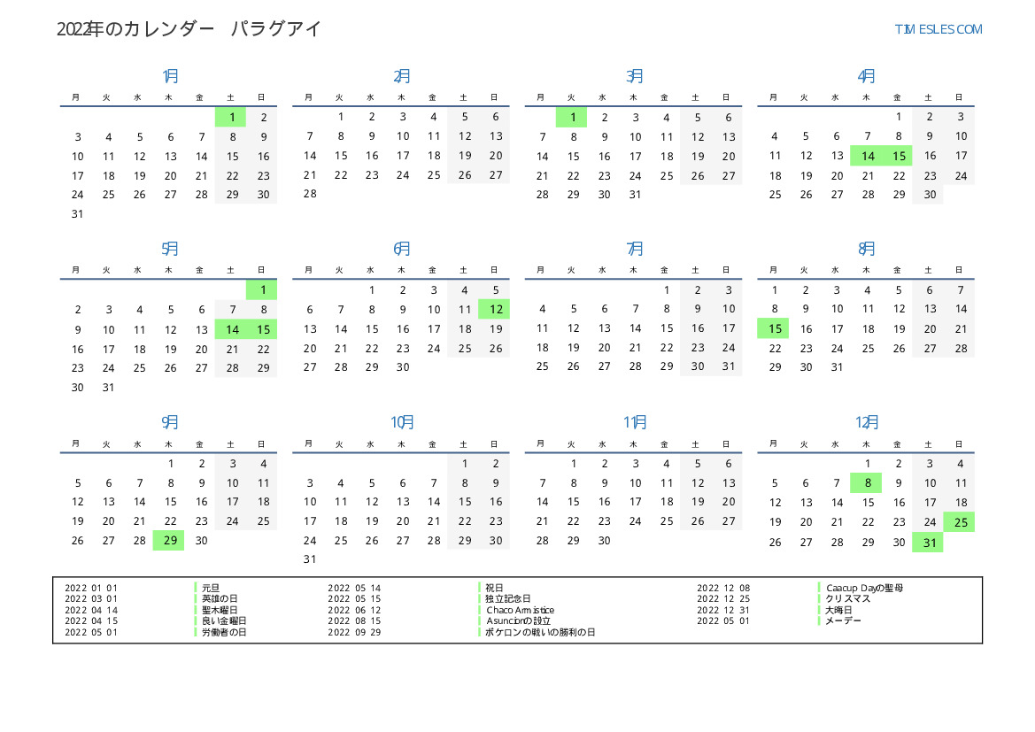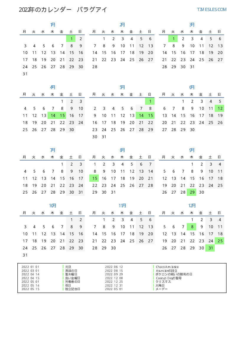 パラグアイ向けの2022年の休日と週末のカレンダー