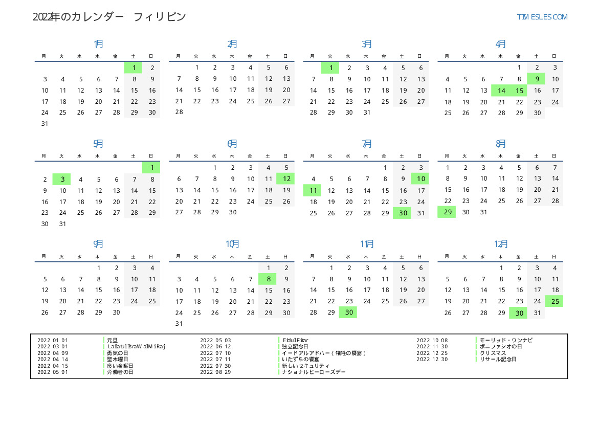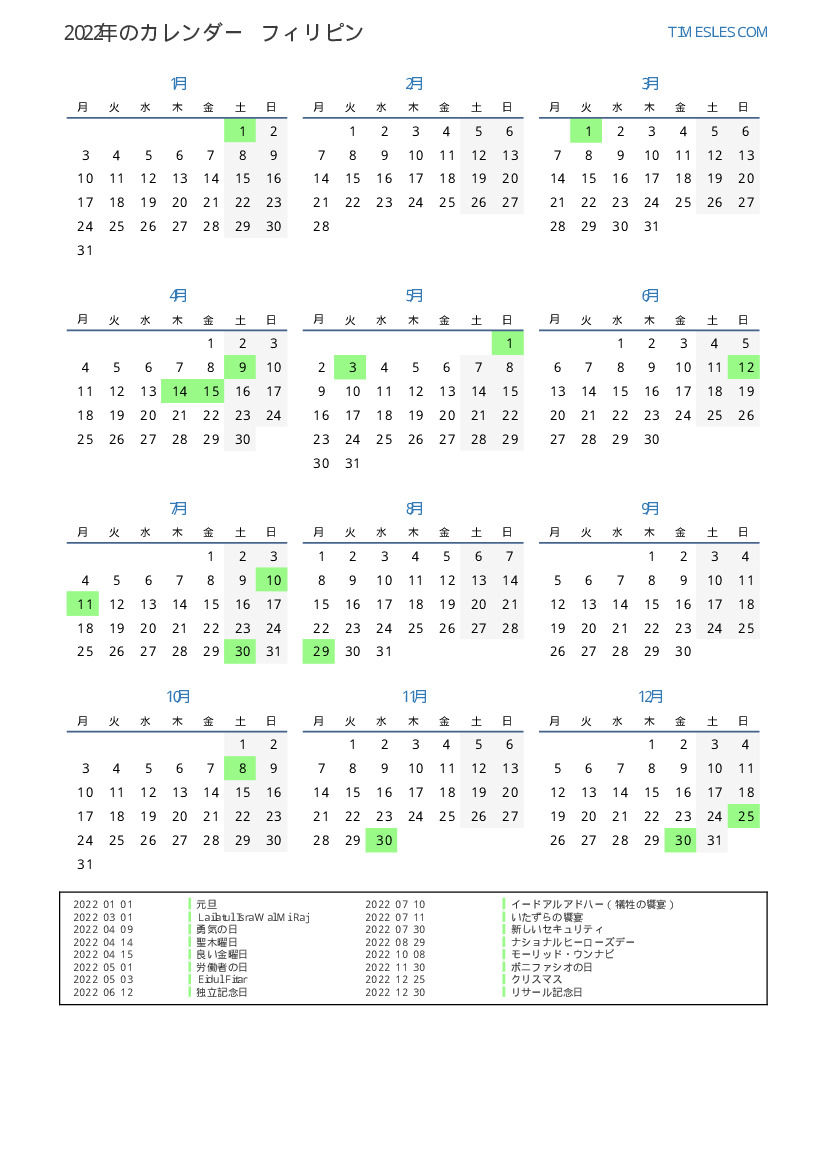 フィリピン向け2022年の休日と週末を含むPDFカレンダーをダウンロードして印刷します