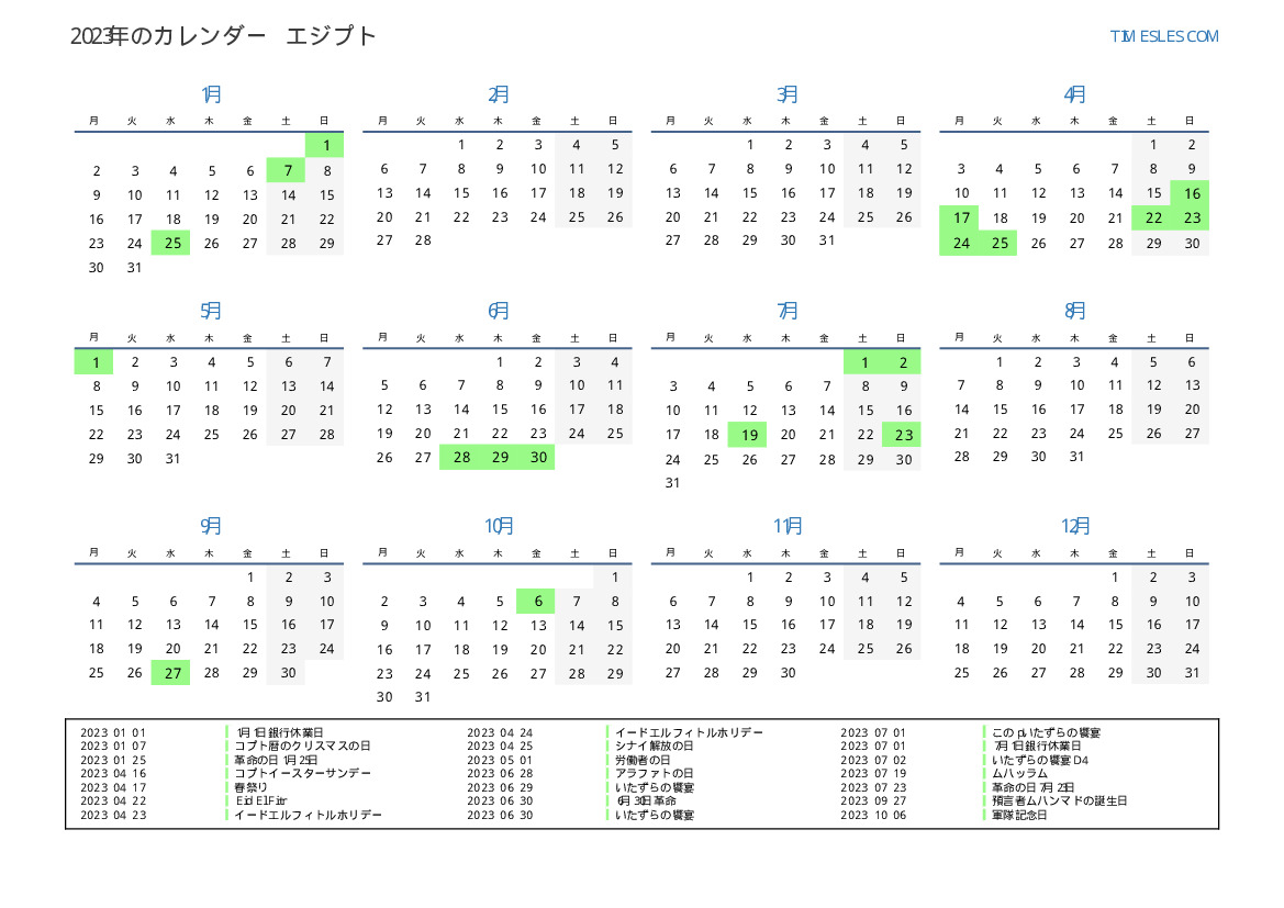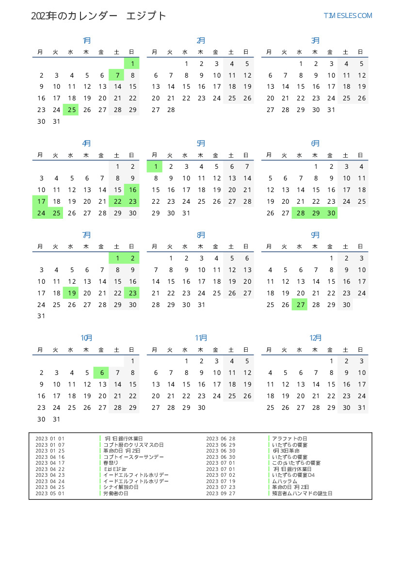 エジプトのために2023年の休日と週末を含むPDFカレンダーをダウンロードして印刷します