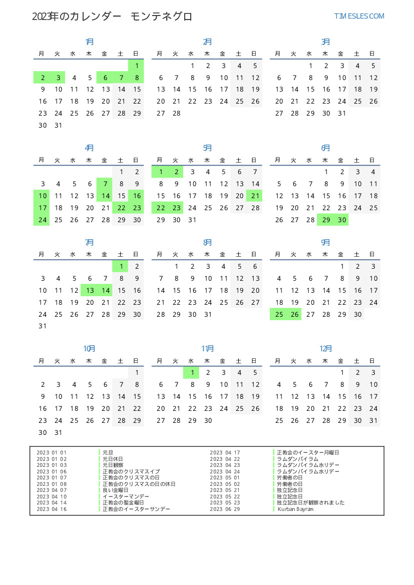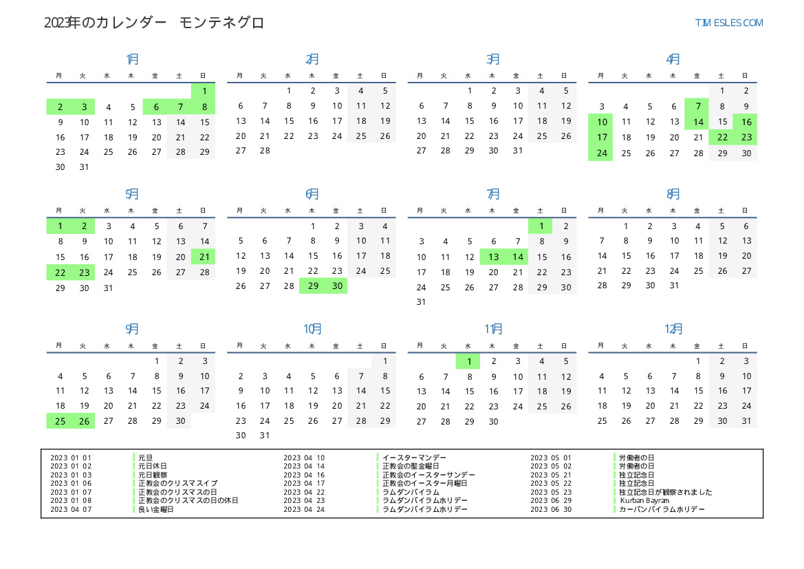 モンテネグロ向けの2023年の休日と週末のカレンダー