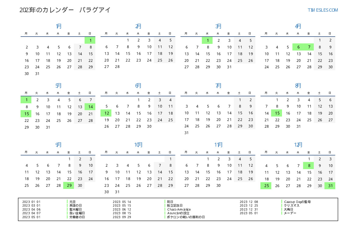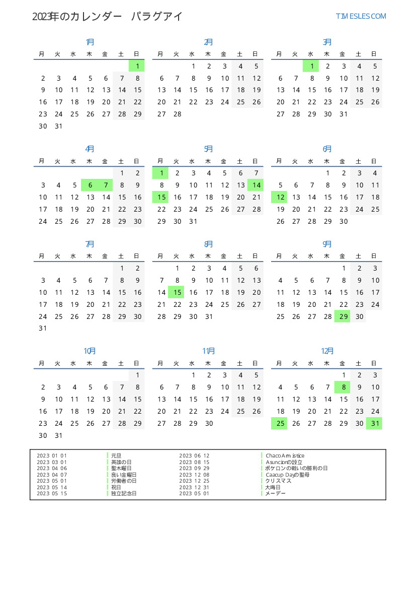 パラグアイ向けの2023年の休日と週末のカレンダー