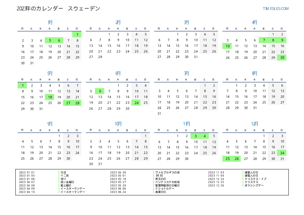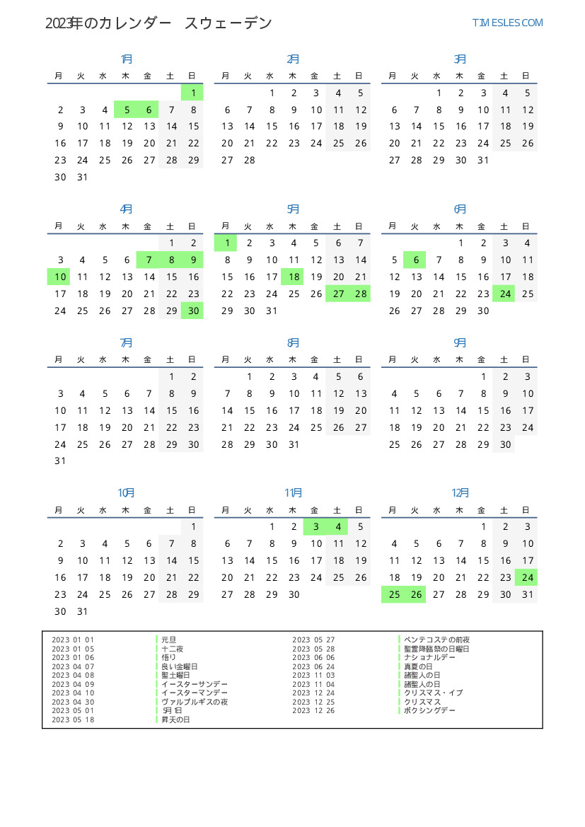スウェーデン向けの2023年の休日と週末のカレンダー