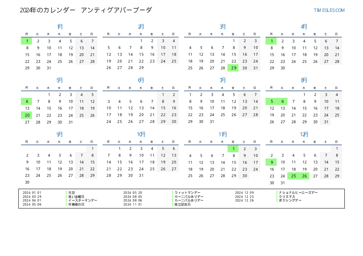アンティグアバーブーダの2024年の休日と週末のカレンダー
