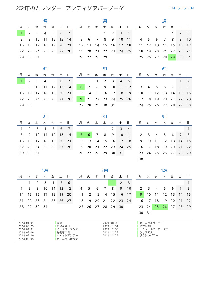 アンティグアバーブーダ2024年の休日と週末を含むPDFカレンダーをダウンロードして印刷します