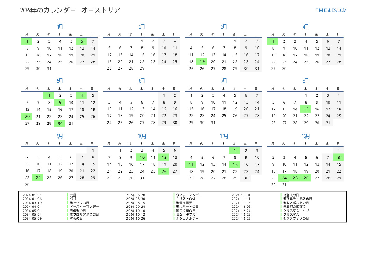 オーストリア向けの2024年の休日と週末のカレンダー