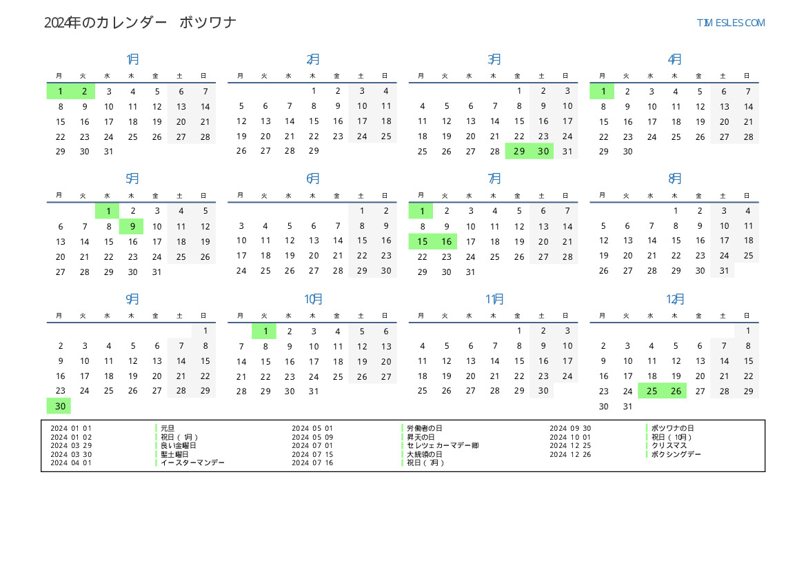ボツワナ向けの2024年の休日と週末のカレンダー