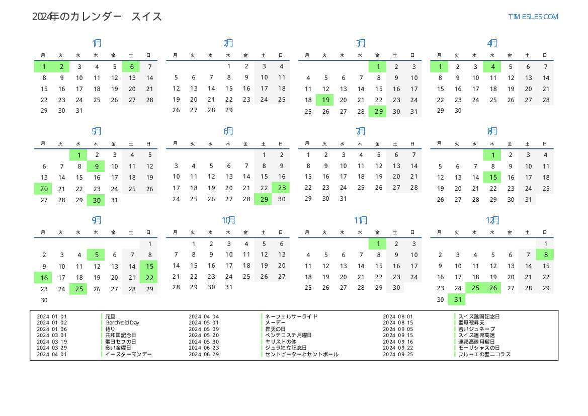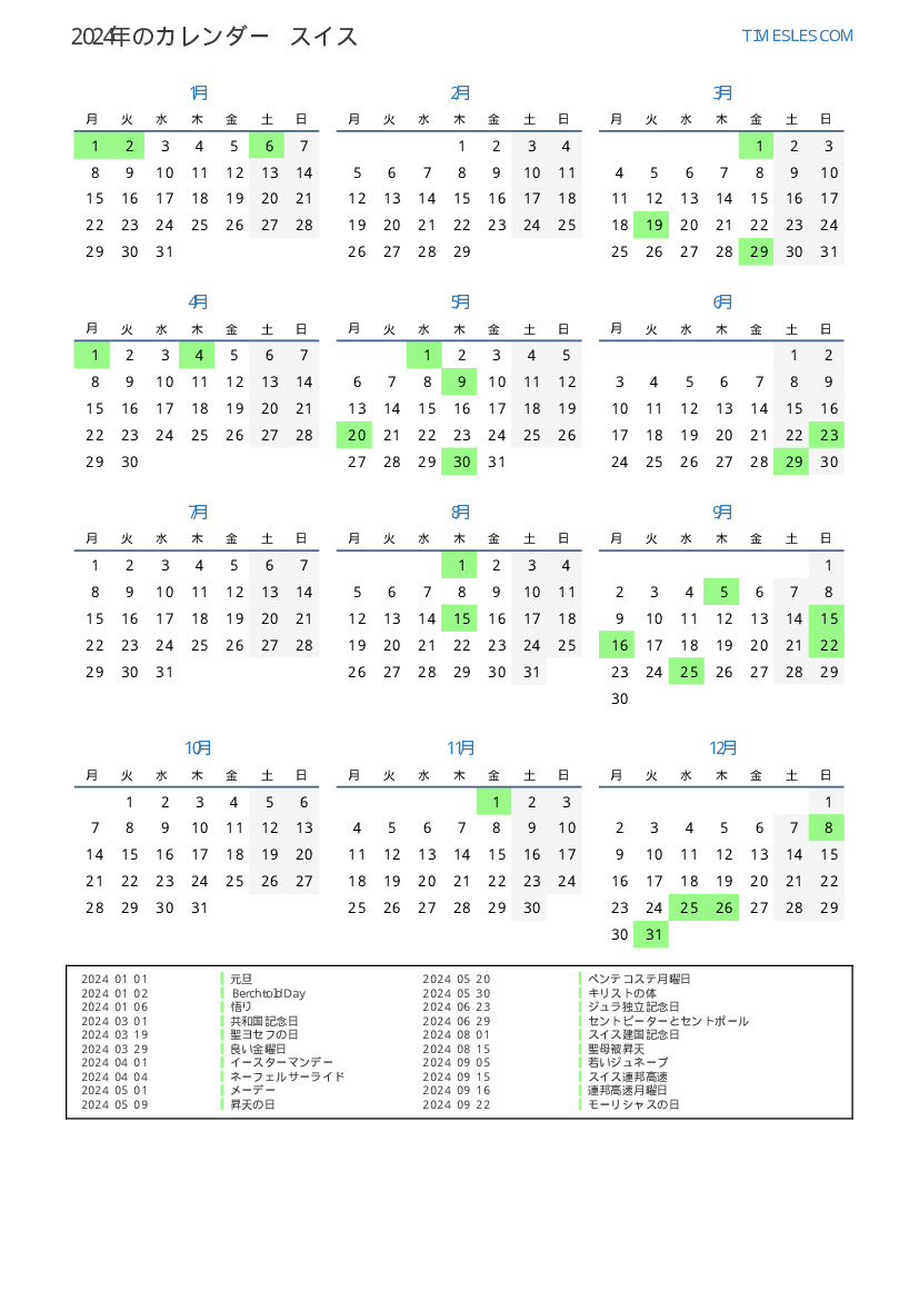 スイス向け2024年の休日と週末を含むPDFカレンダーをダウンロードして印刷します