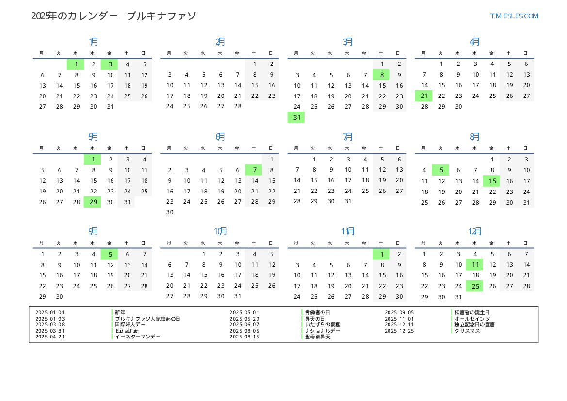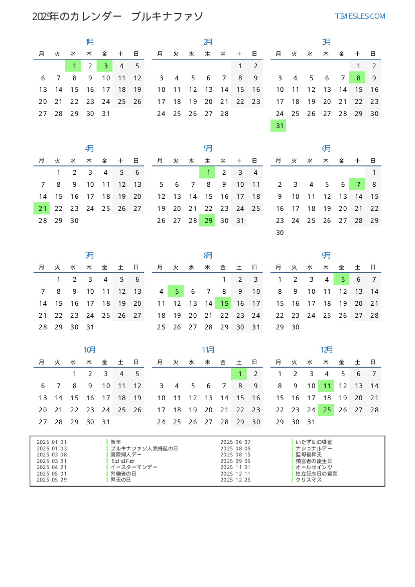 ブルキナファソ2025年の休日と週末を含むPDFカレンダーをダウンロードして印刷します