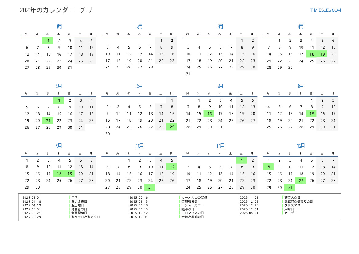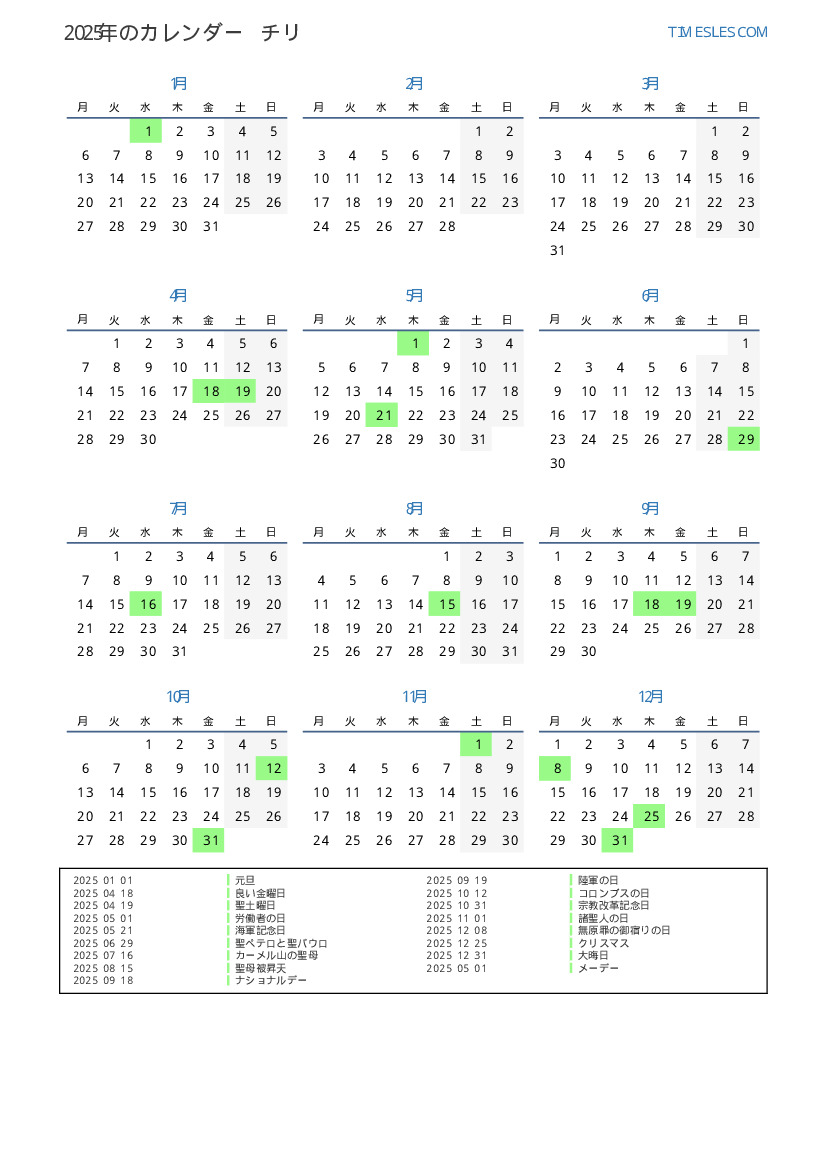 チリ向け2025年の休日と週末を含むPDFカレンダーをダウンロードして印刷します
