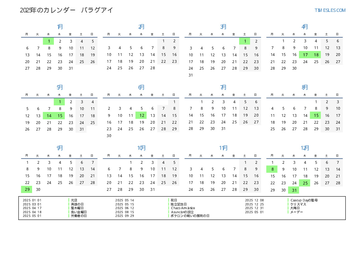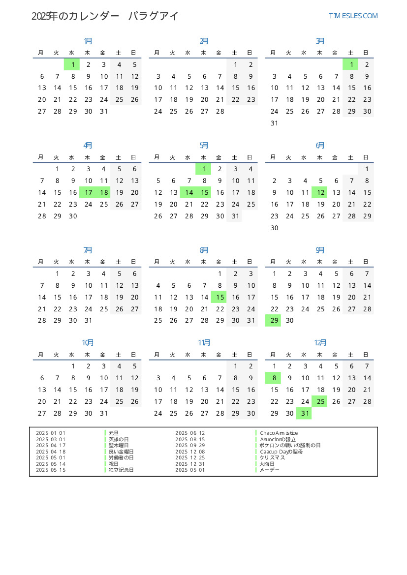 パラグアイ向けの2025年の休日と週末のカレンダー