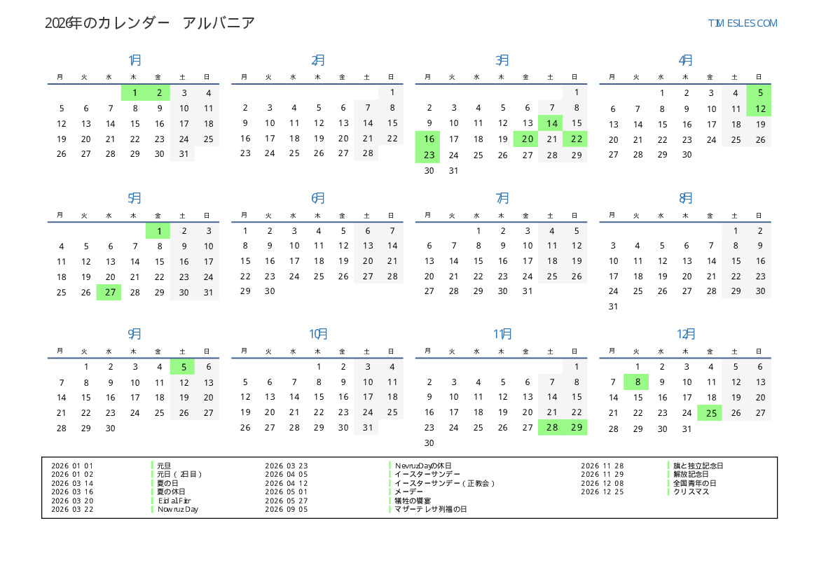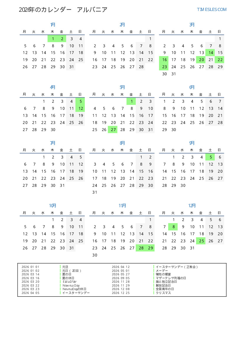 アルバニアの場合の2026年の休日と週末のカレンダー