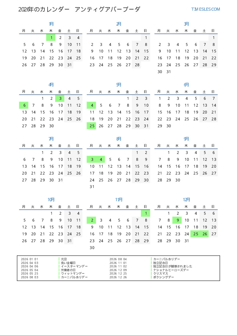 アンティグアバーブーダの2026年の休日と週末のカレンダー