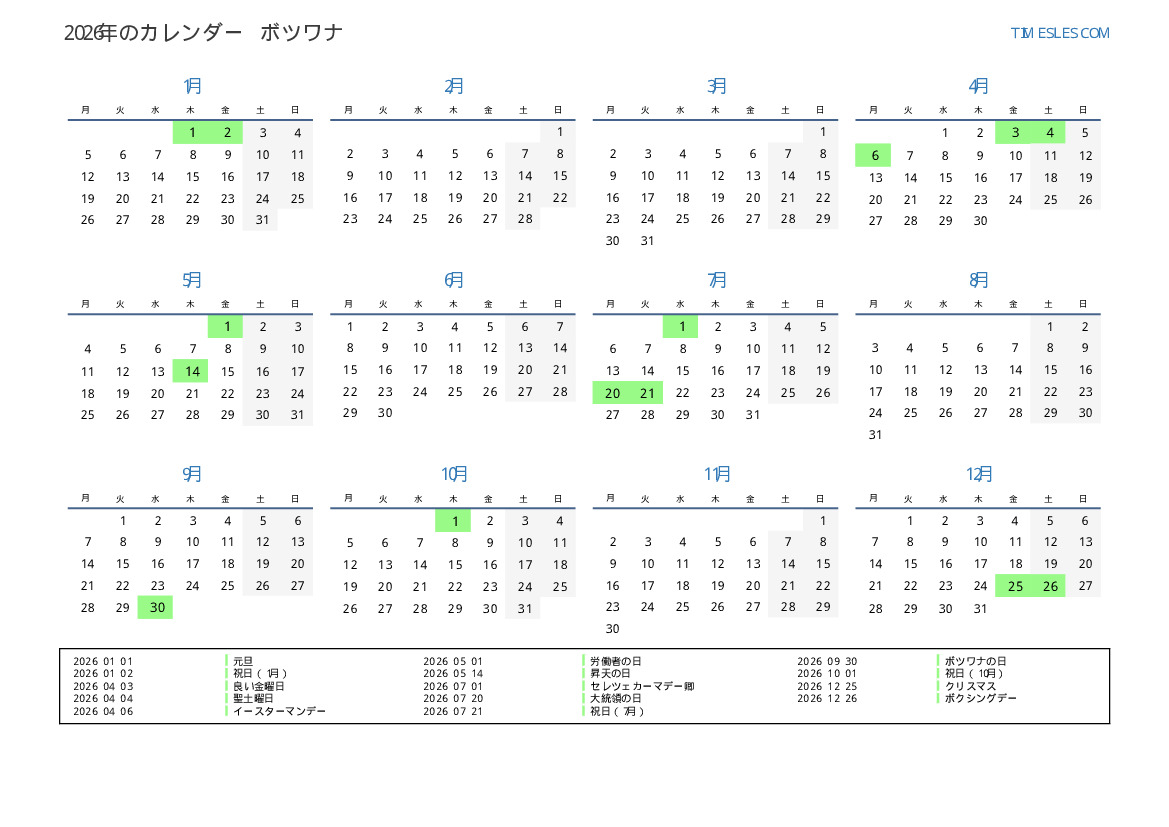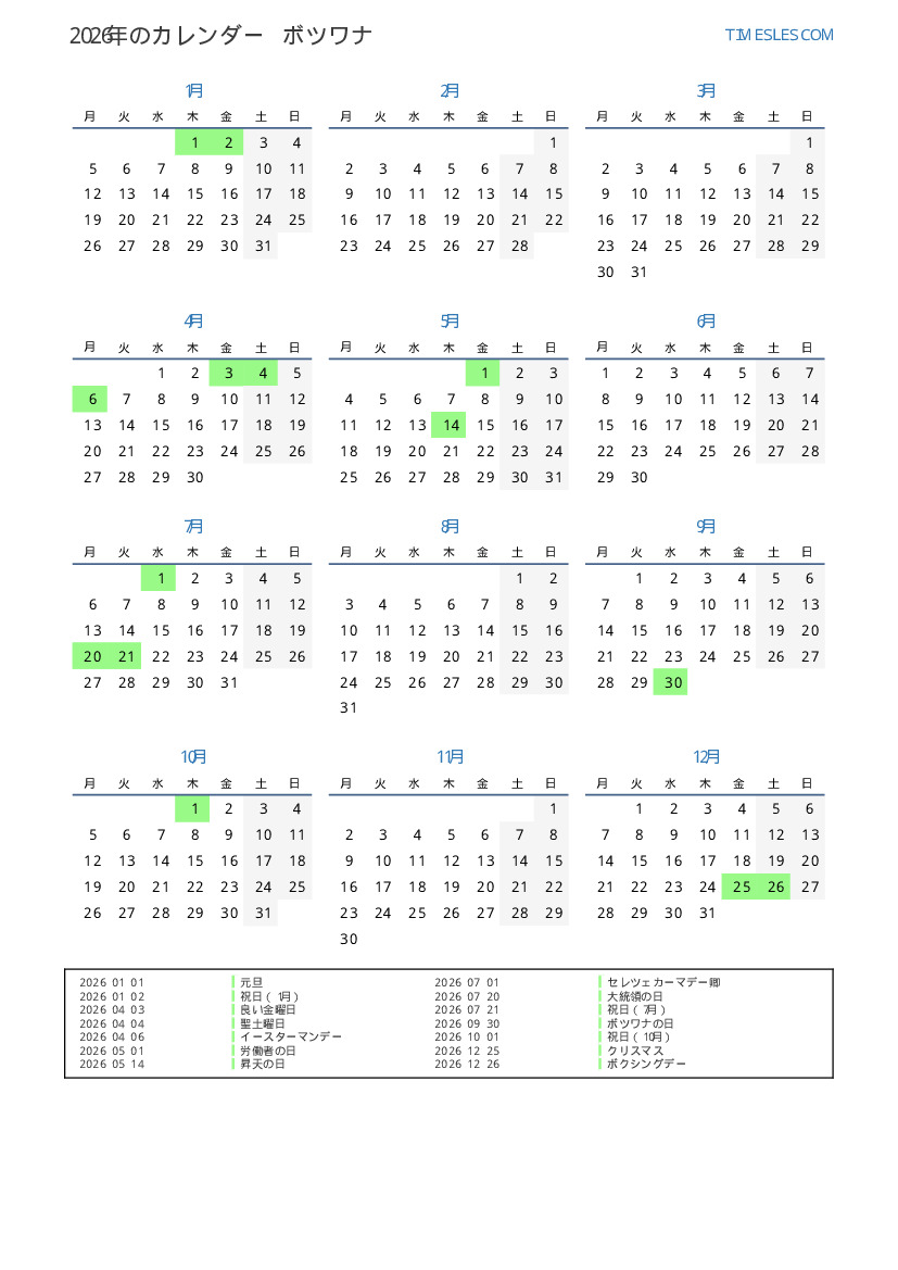 ボツワナ向けの2026年の休日と週末のカレンダー