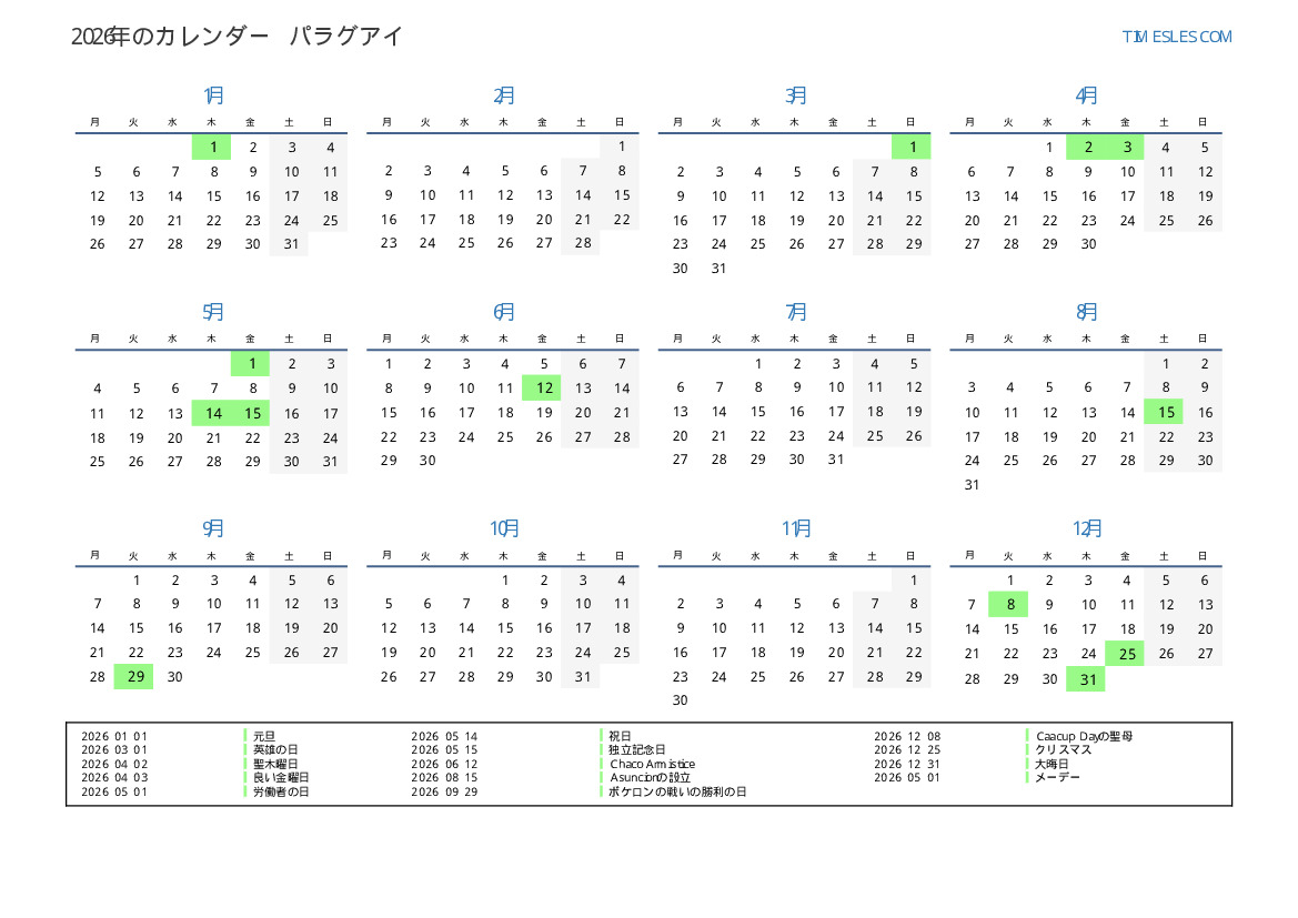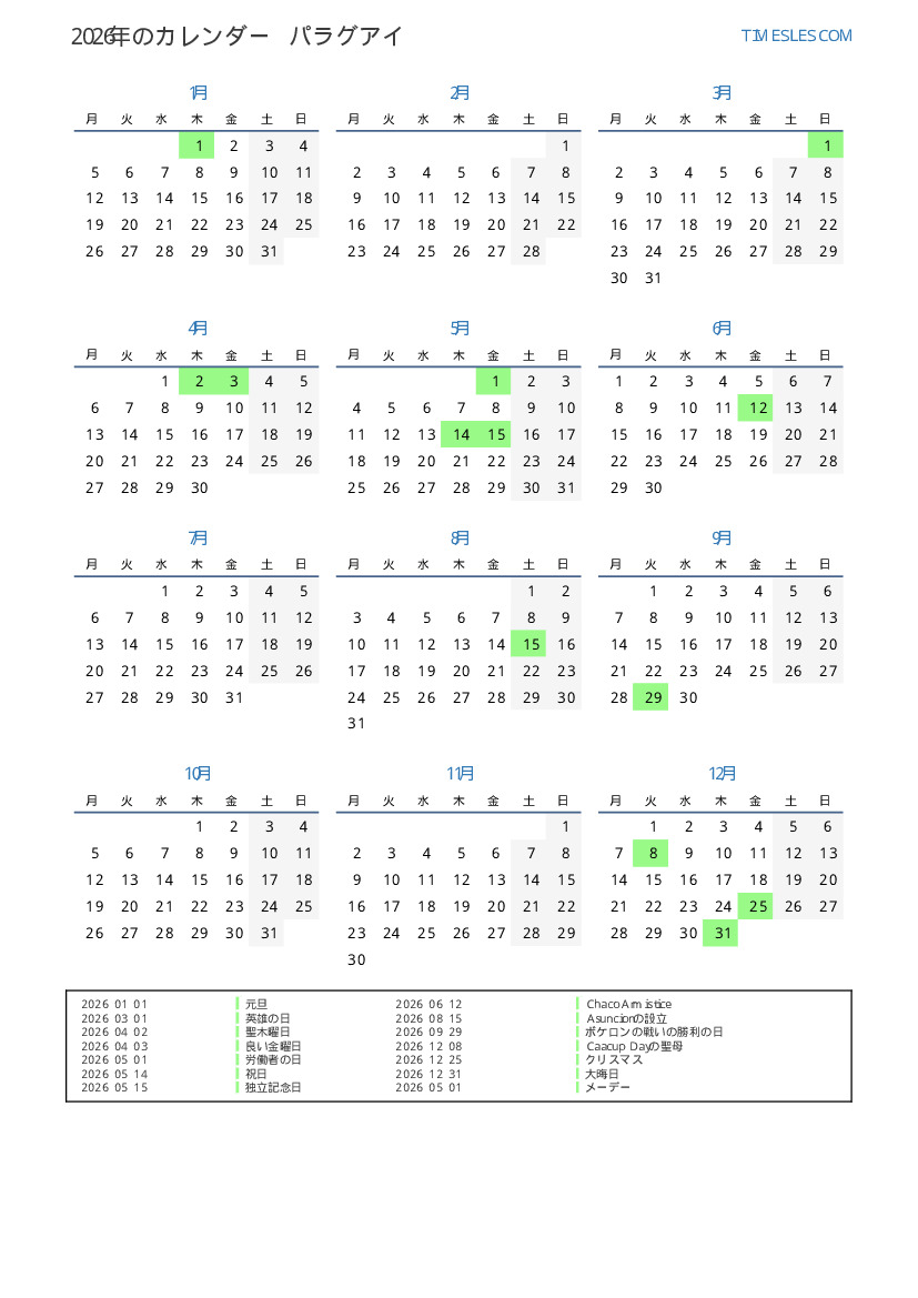 パラグアイ向けの2026年の休日と週末のカレンダー