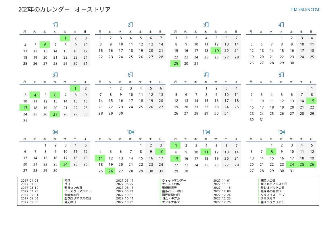 オーストリア向けの2027年の休日と週末のカレンダー