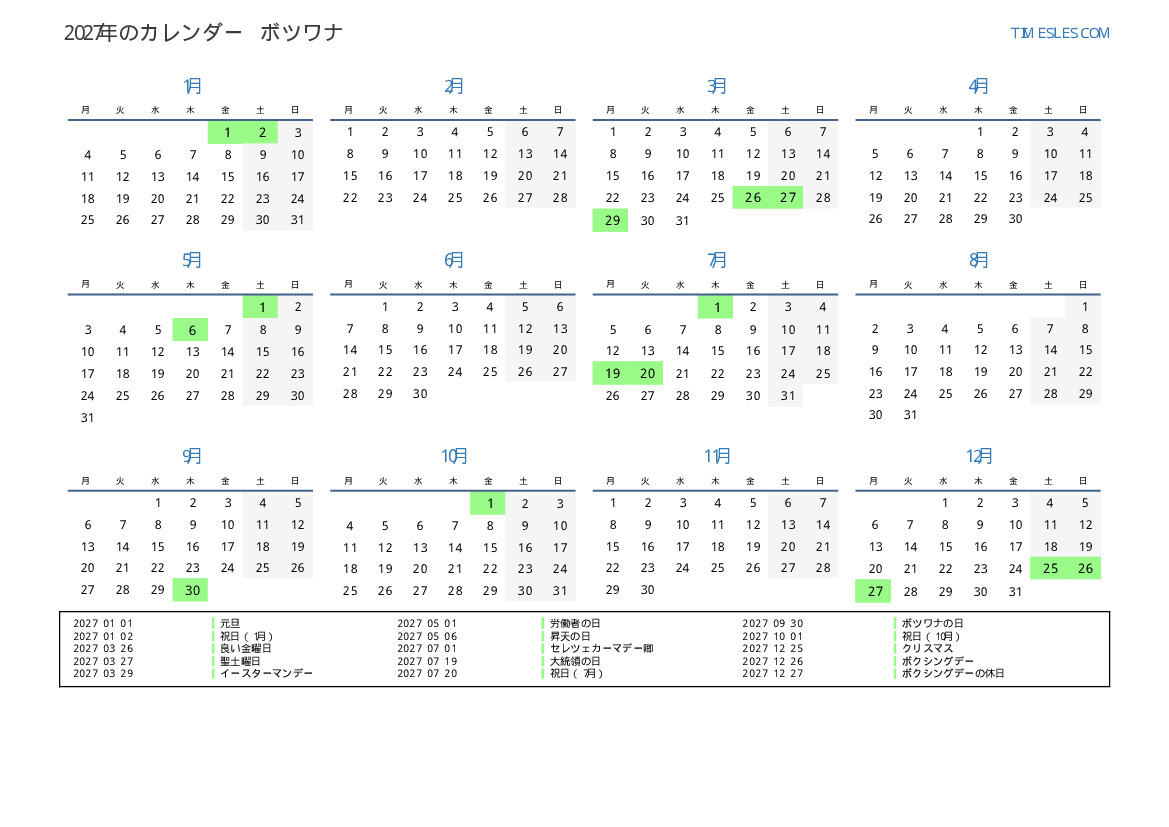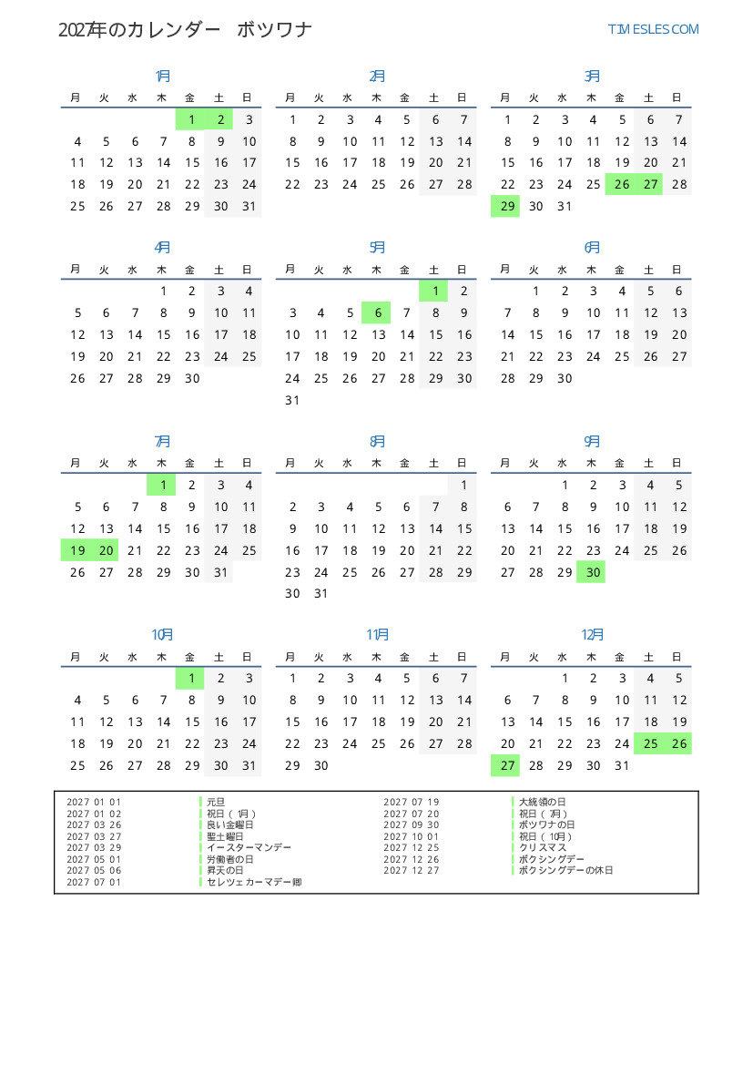 ボツワナ向けの2027年の休日と週末のカレンダー