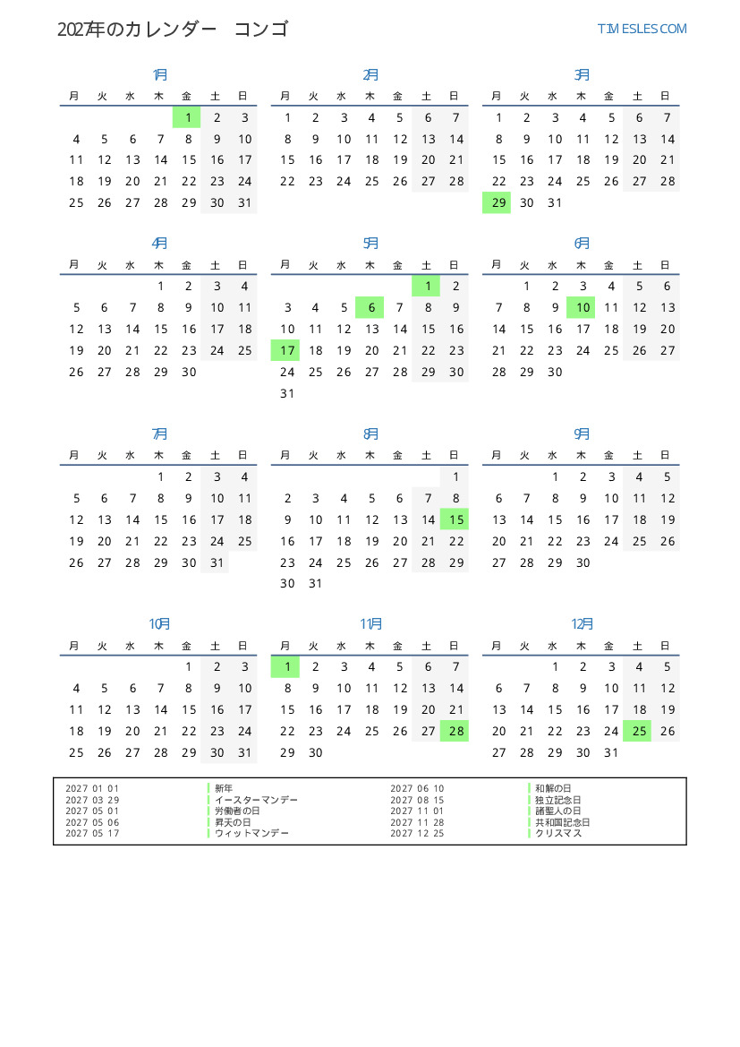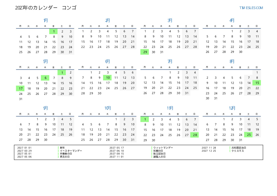 コンゴのために2027年の休日と週末を含むPDFカレンダーをダウンロードして印刷します