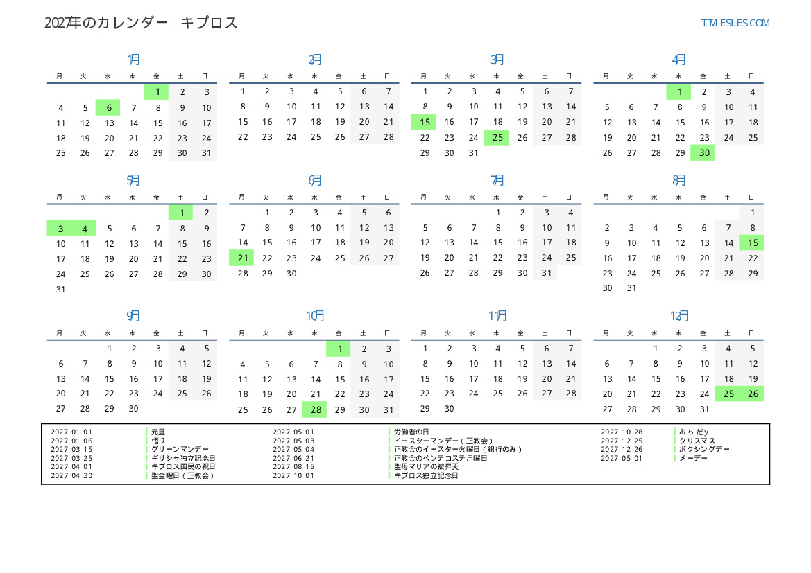 キプロス向け2027年の休日と週末を含むPDFカレンダーをダウンロードして印刷します