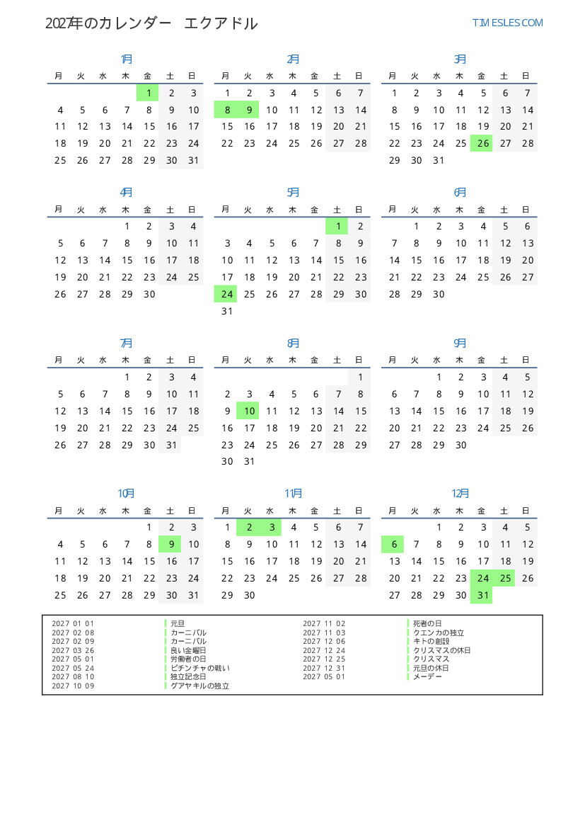 エクアドル向けの2027年の休日と週末のカレンダー