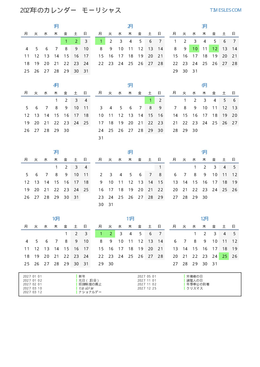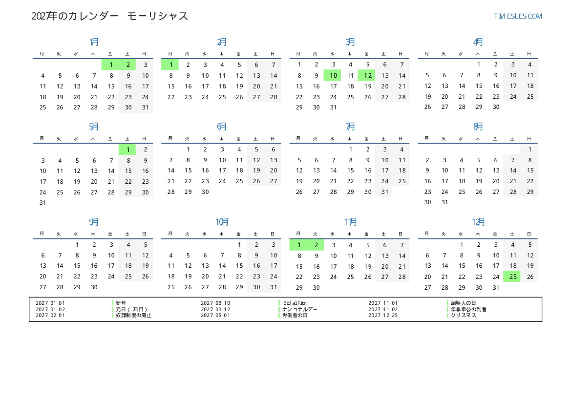 モーリシャスのためにの2027年の休日と週末のカレンダー