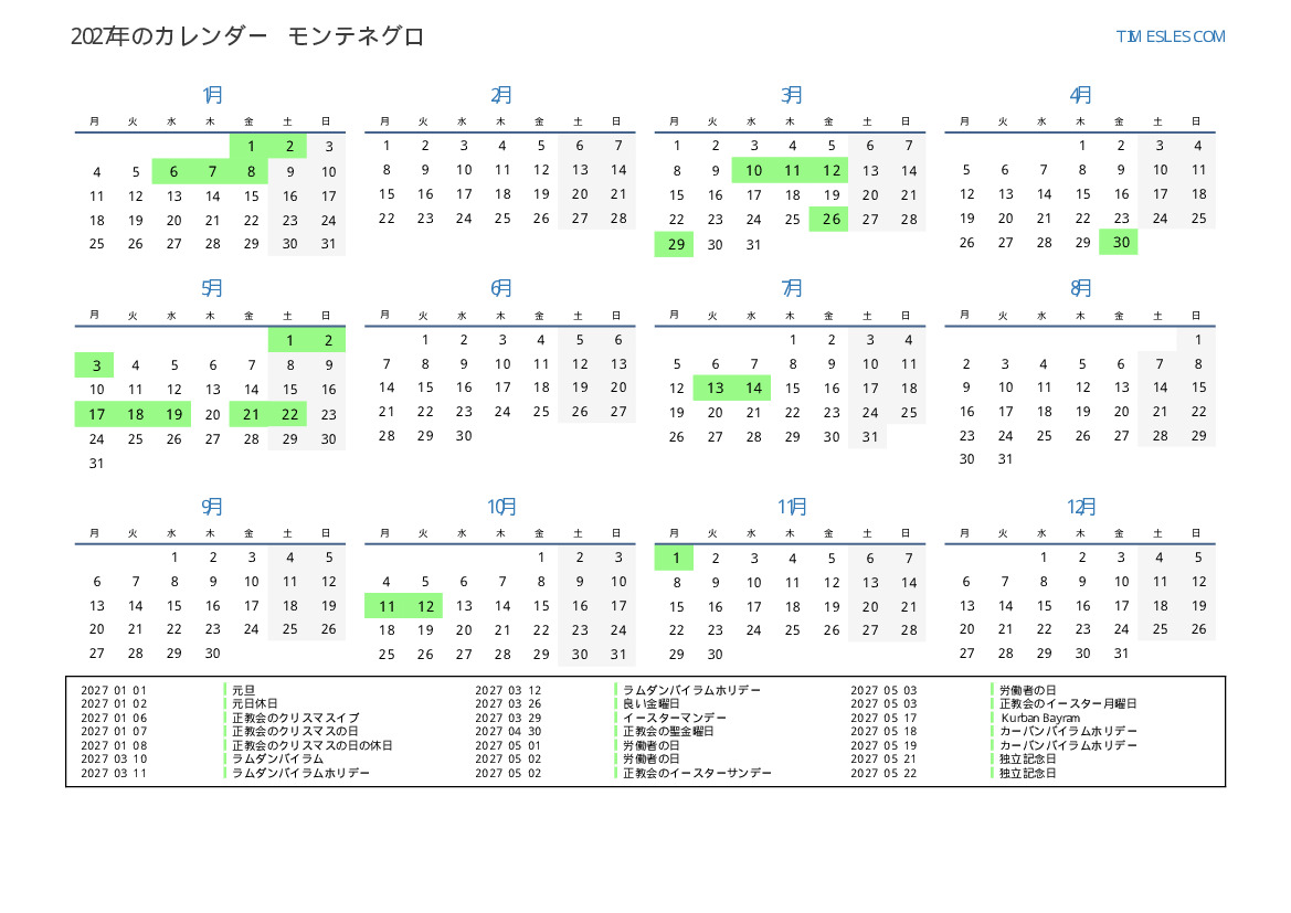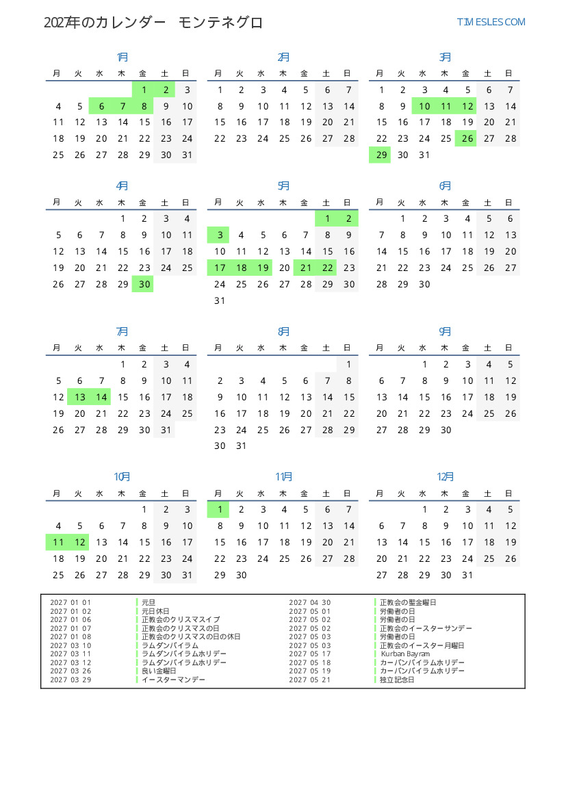 モンテネグロ向けの2027年の休日と週末のカレンダー